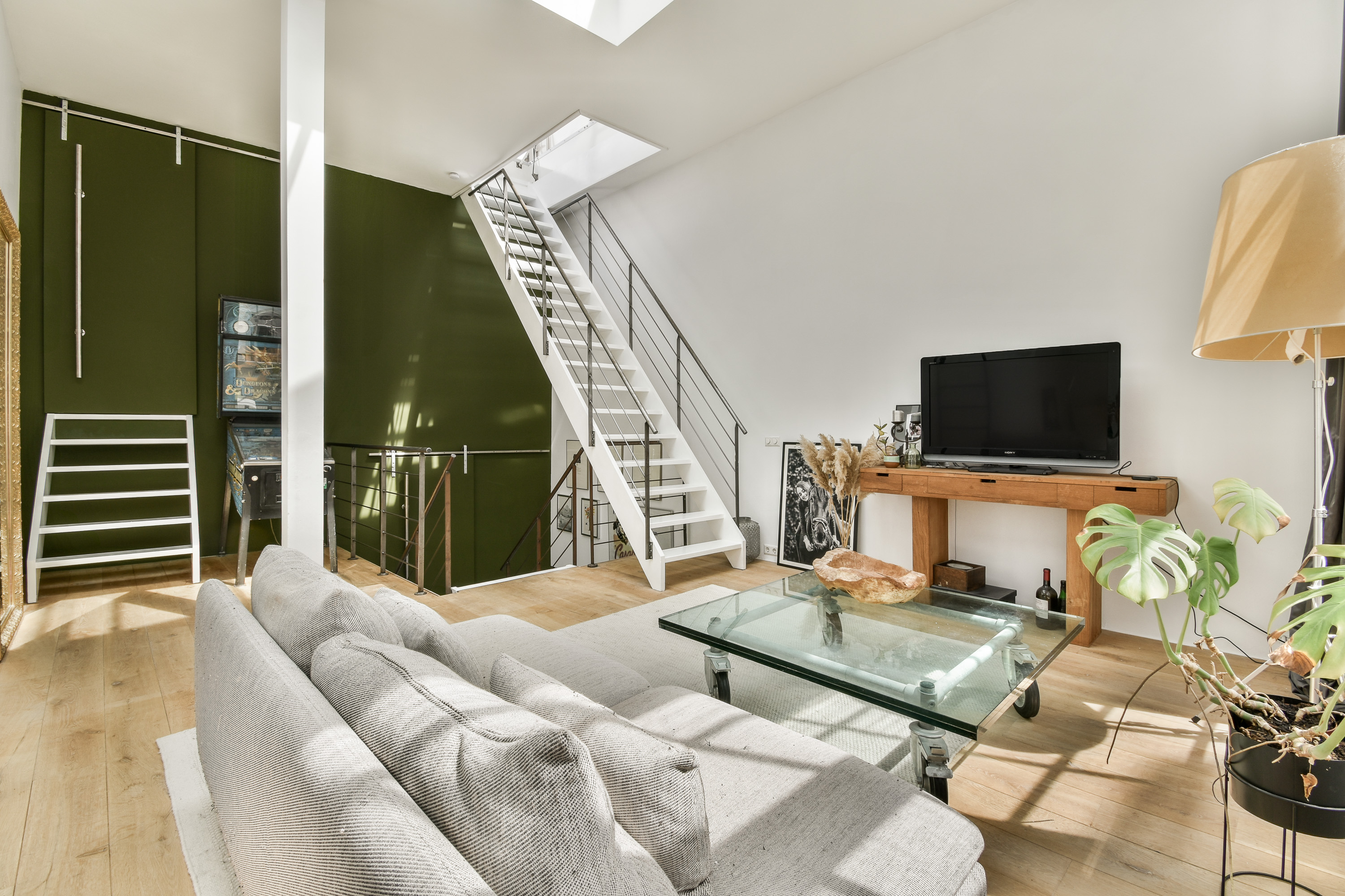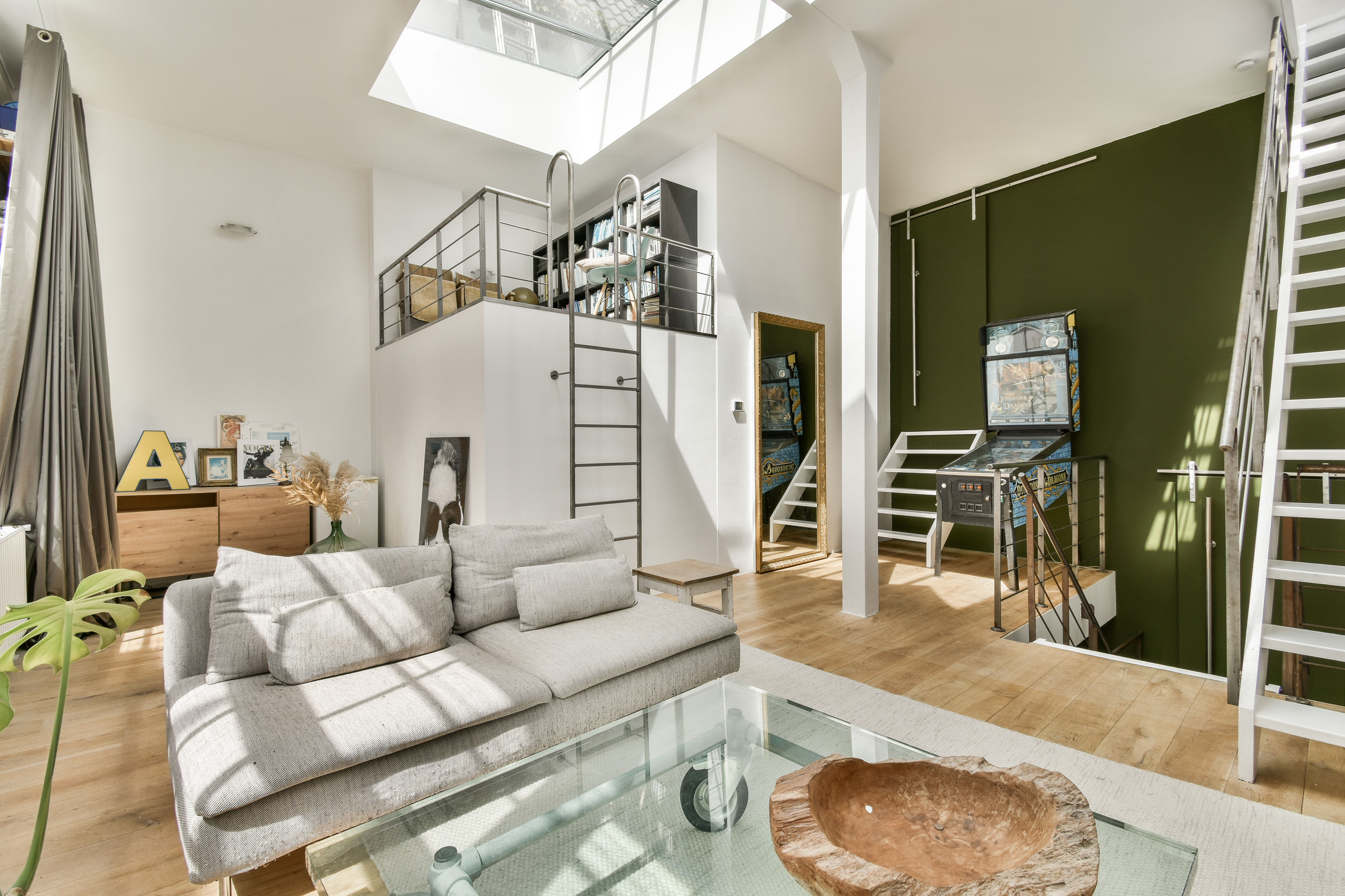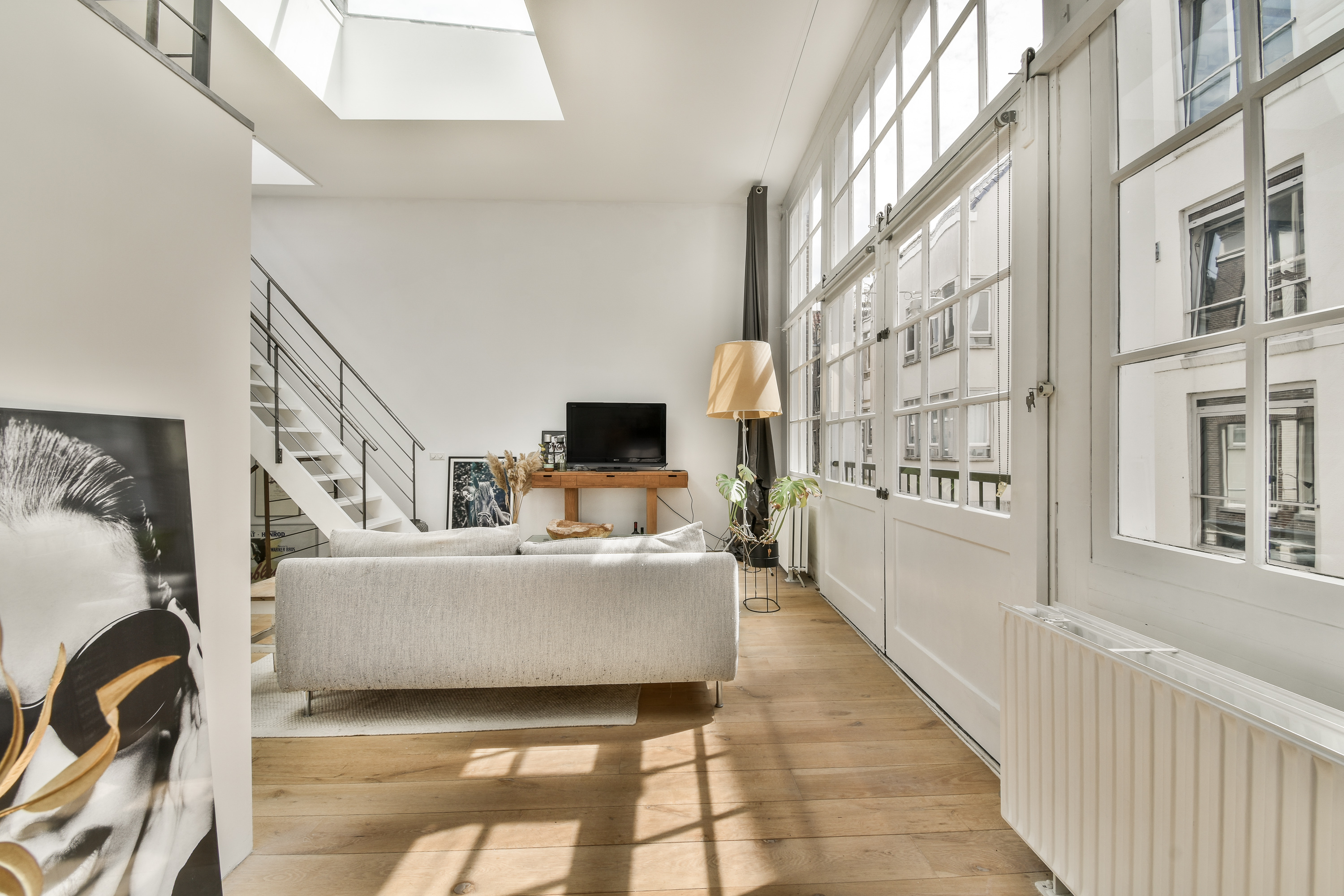 A bright and expansive living room with ceiling height of approximately 3.72 metres, almost floor-to-ceiling windows and a dramatic skylight overhead. This level also includes two bedrooms and a mezzanine loft of around 5 square metres, ideal as a walk-in wardrobe or extra storage. A fixed staircase from the living room leads to the roof terrace.