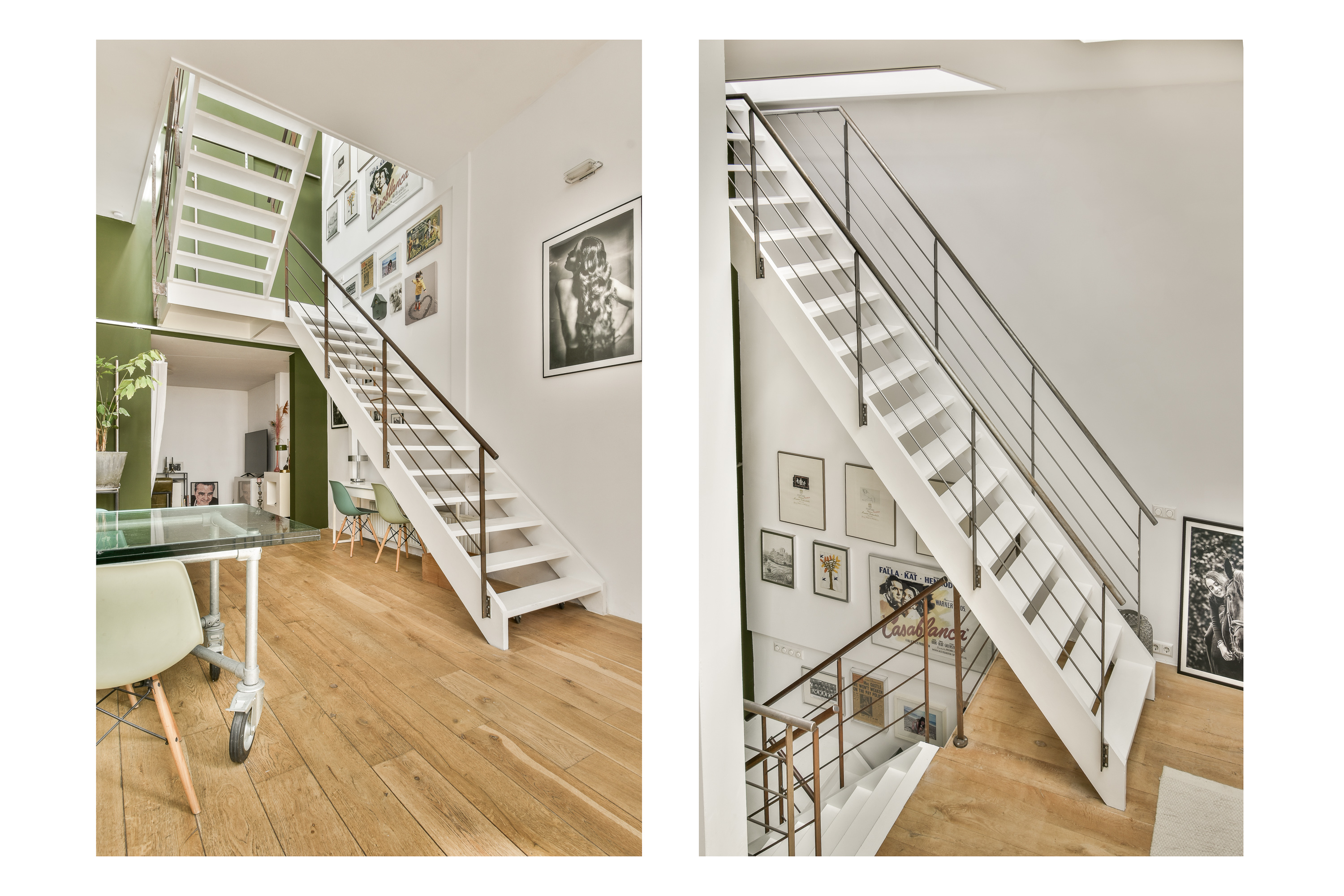 Spacious private entrance with ceiling height of approximately 3.78 metres. To the left is a large kitchen and dining area with almost full-length windows that flood the room with natural light. Towards the rear is a cosy sitting room and a modern bathroom with walk-in shower, washbasin and toilet. To the right, a beautifully designed staircase leads to the upper levels, drawing daylight from the skylight above.