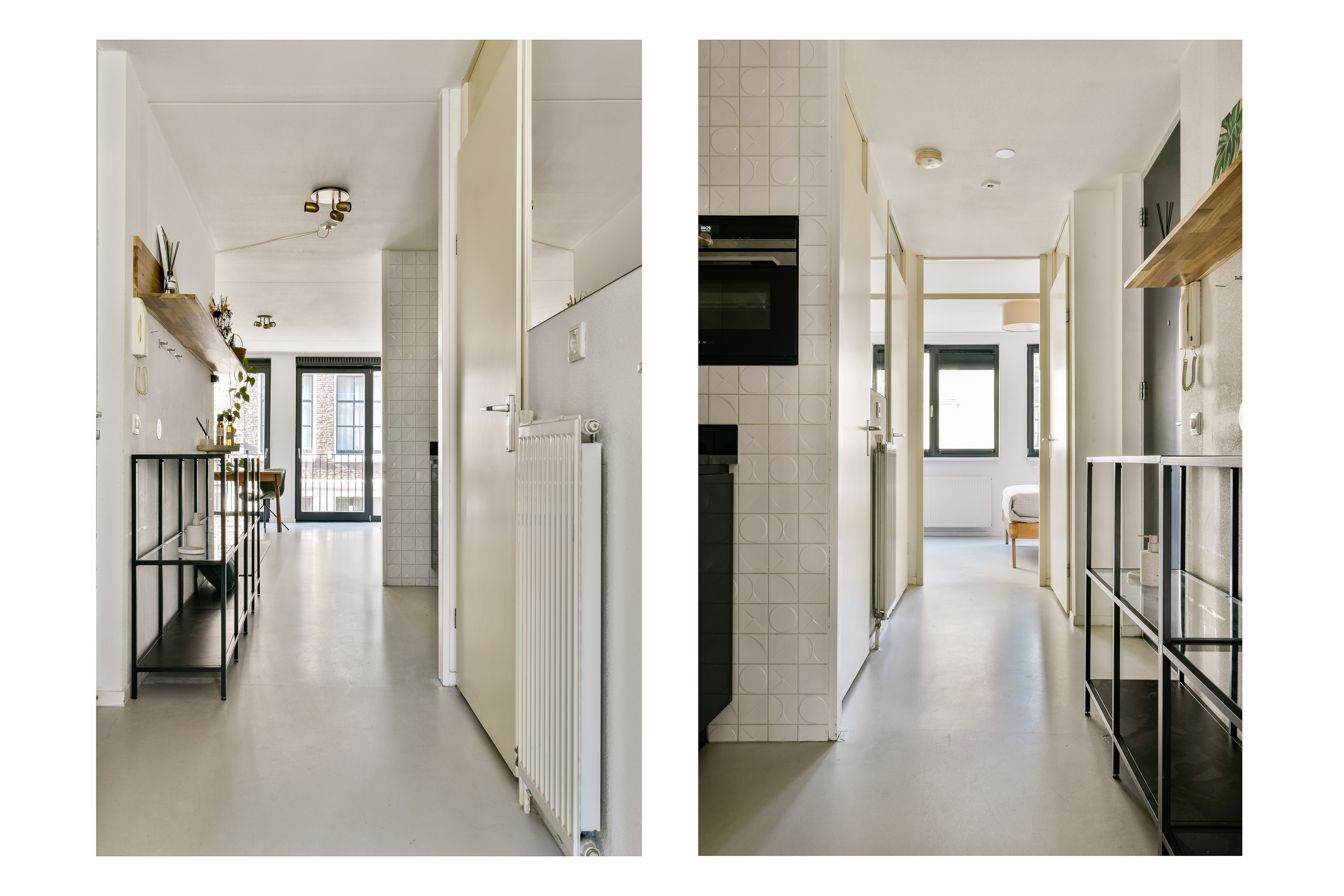 Via de centrale entree op de begane grond bereik je het trappenhuis en de privé bergingen. Op de tweede verdieping bevindt zich de entree van het appartement. Aan de voorzijde ligt de lichte woonkamer met grote raampartijen van vloer tot plafond, wat zorgt voor veel daglicht en een ruimtelijk gevoel. De open keuken is voorzien van hoogwaardige inbouwapparatuur, waaronder een PulseSteam oven, vaatwasser en koel-/vriescombinatie van Siemens, evenals een Quooker en een natuurstenen werkblad.