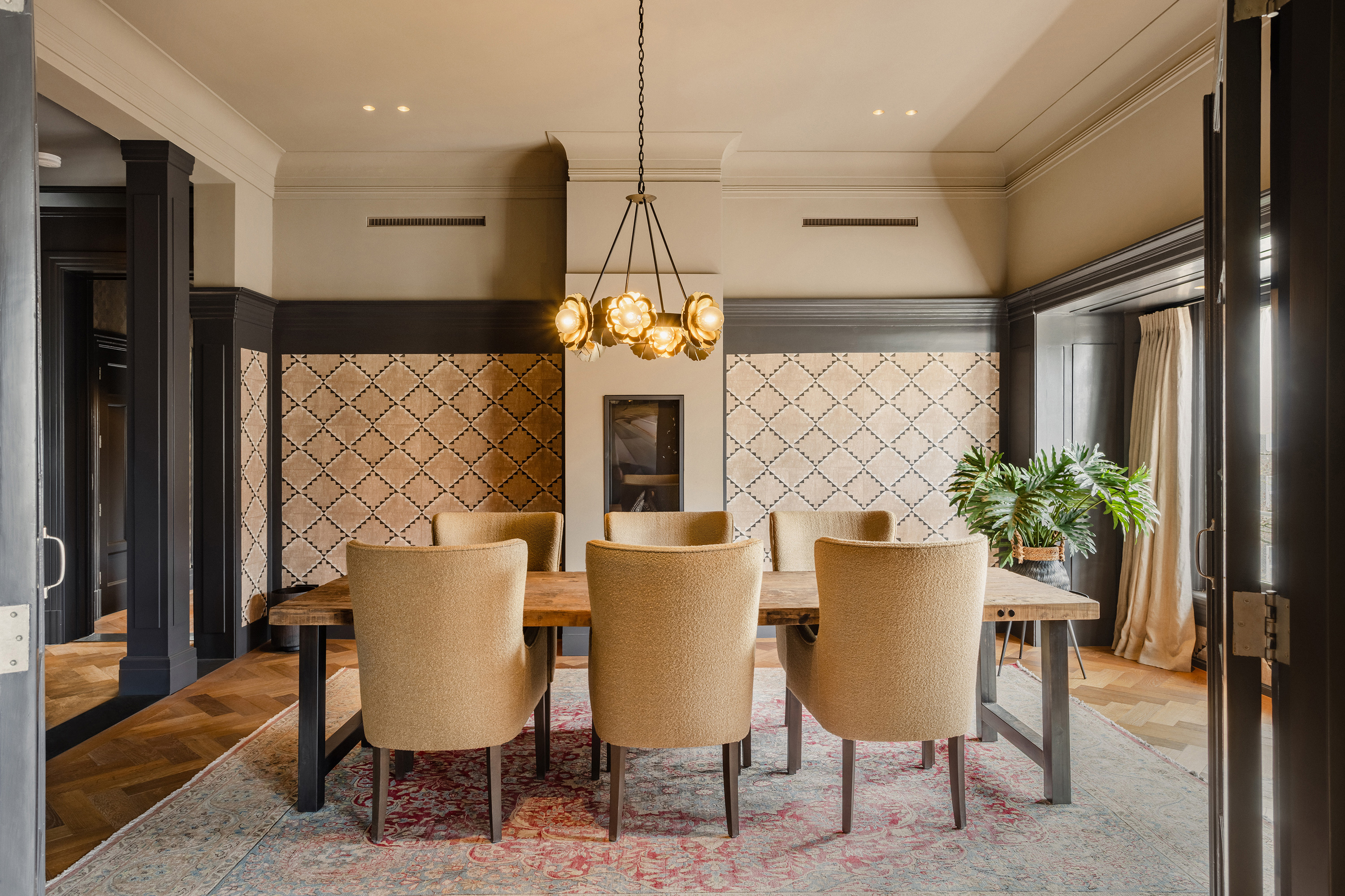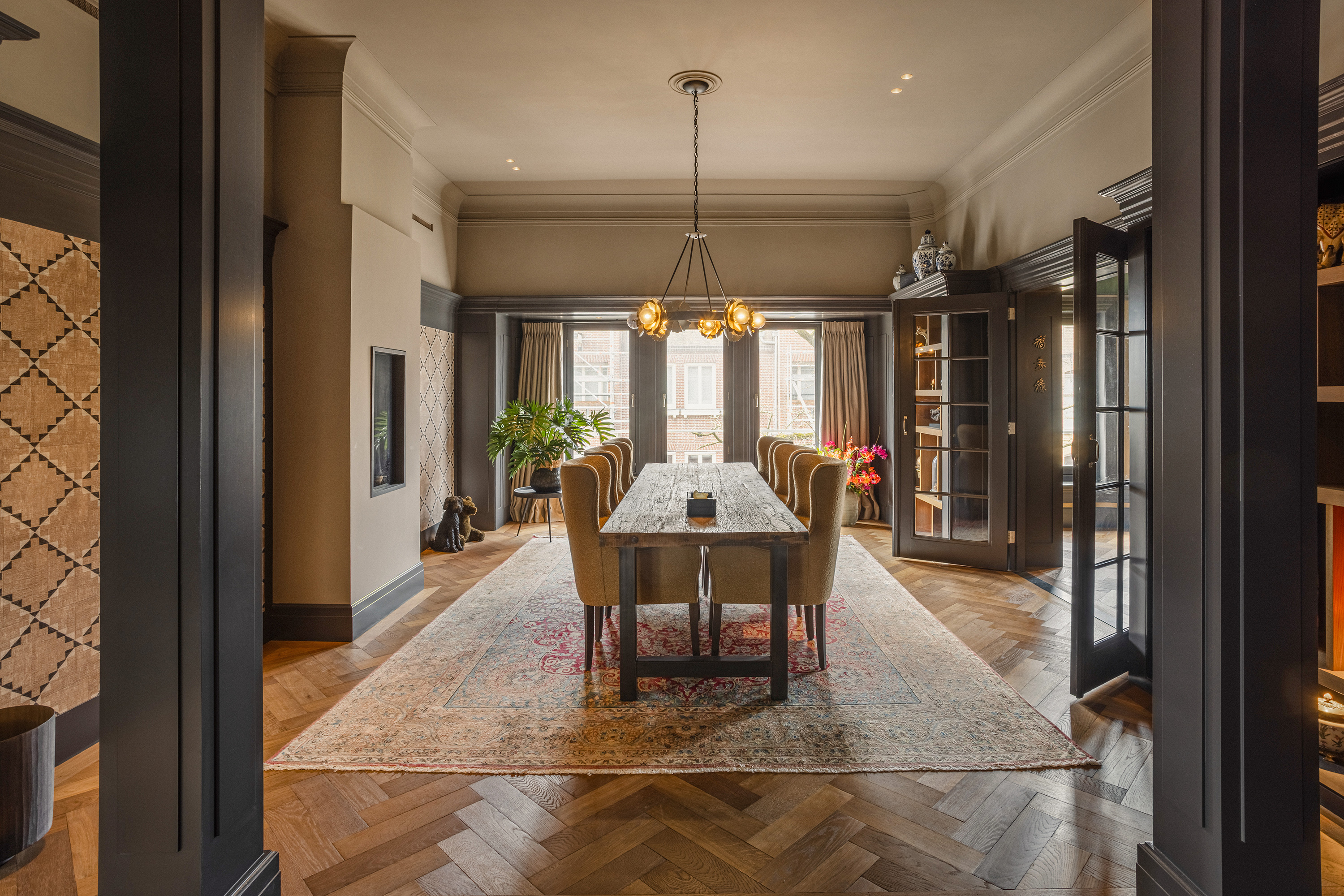 The dining room forms the heart of the floor, a place where long evenings unfold effortlessly. A fireplace adds warmth and intimacy, while the space connects seamlessly to the kitchen.