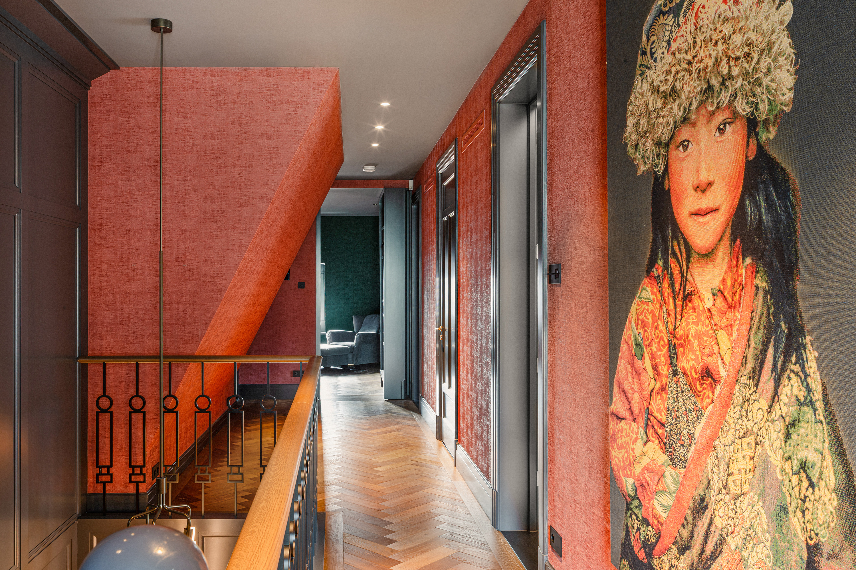 Arrival is understated and serene. The central hall forms a natural transition into the living spaces, where height, light and materials come together in a balanced composition.