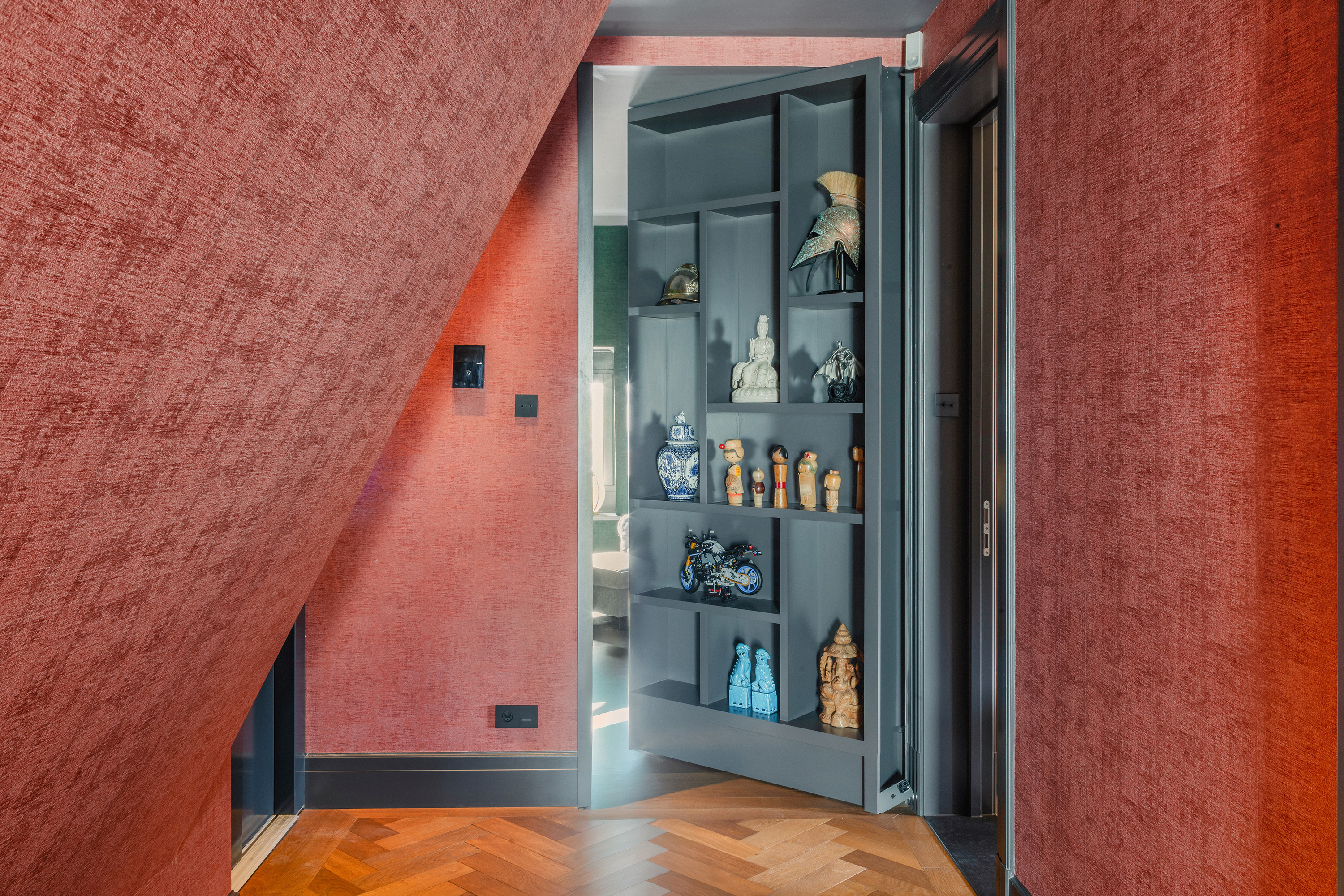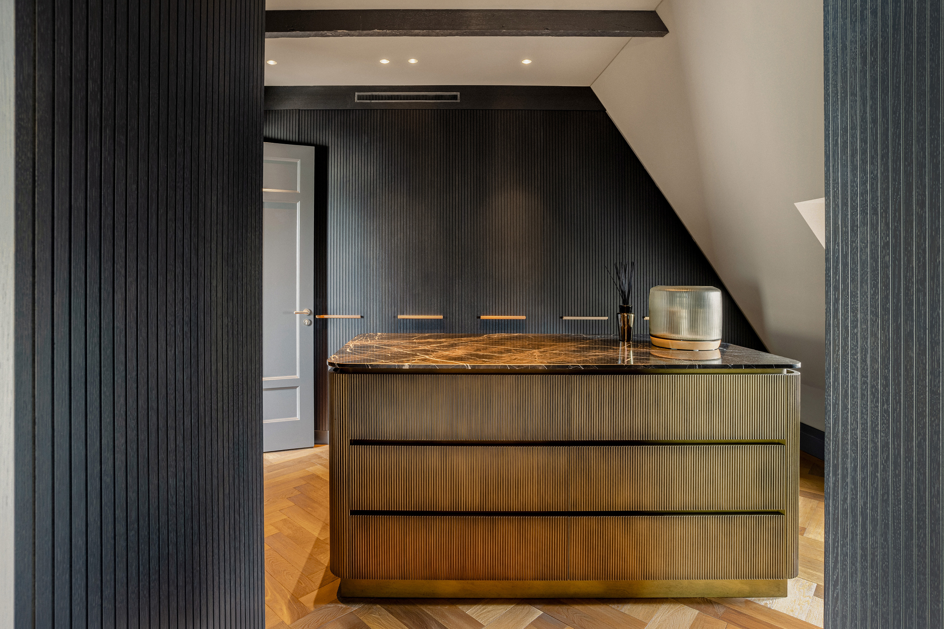 In de woonkamer zorgen maatwerk kasten en een geïntegreerde haard voor rust en samenhang. De erker biedt een meer besloten zithoek, badend in daglicht en met zicht op het leven van de stad. Op deze verdieping bevinden zich daarnaast meerdere kamers die zich flexibel laten gebruiken, als slaapkamer, werkkamer of logeerruimte, aangevuld met een badkamer, separate toiletten en een ruime garderobe.