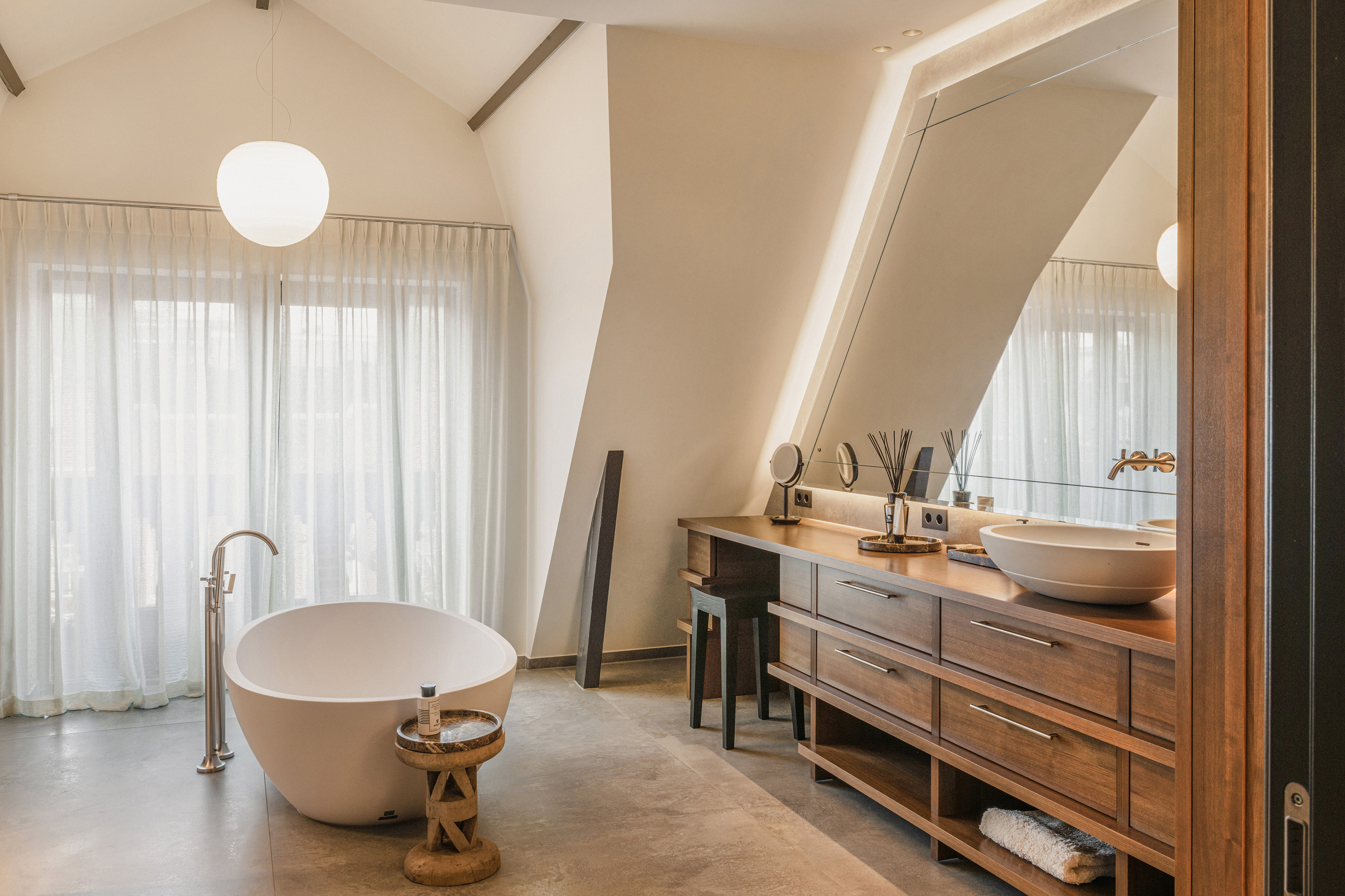 De badkamer is uitgevoerd met zorg en aandacht voor detail, met onder meer een ligbad, inloopdouche met sunshower en een Frans balkon dat extra licht en lucht toevoegt. Aanvullend bevindt zich hier een tweede badkamer.