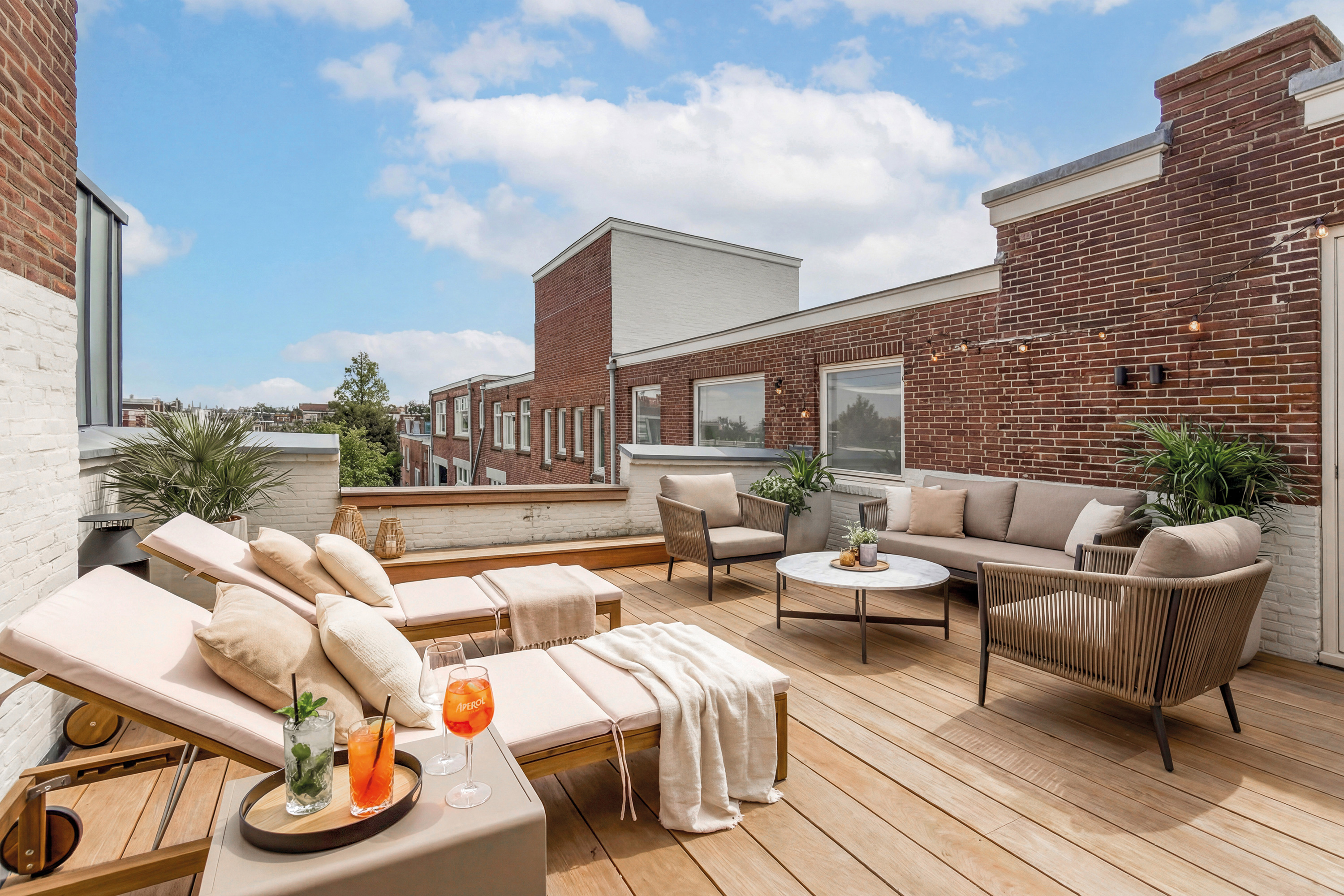 Het dakterras van circa 30 m² ligt beschut en biedt gedurende de dag zon. Een plek voor een vroege koffie of een lange avond, met de stad op afstand maar altijd nabij.