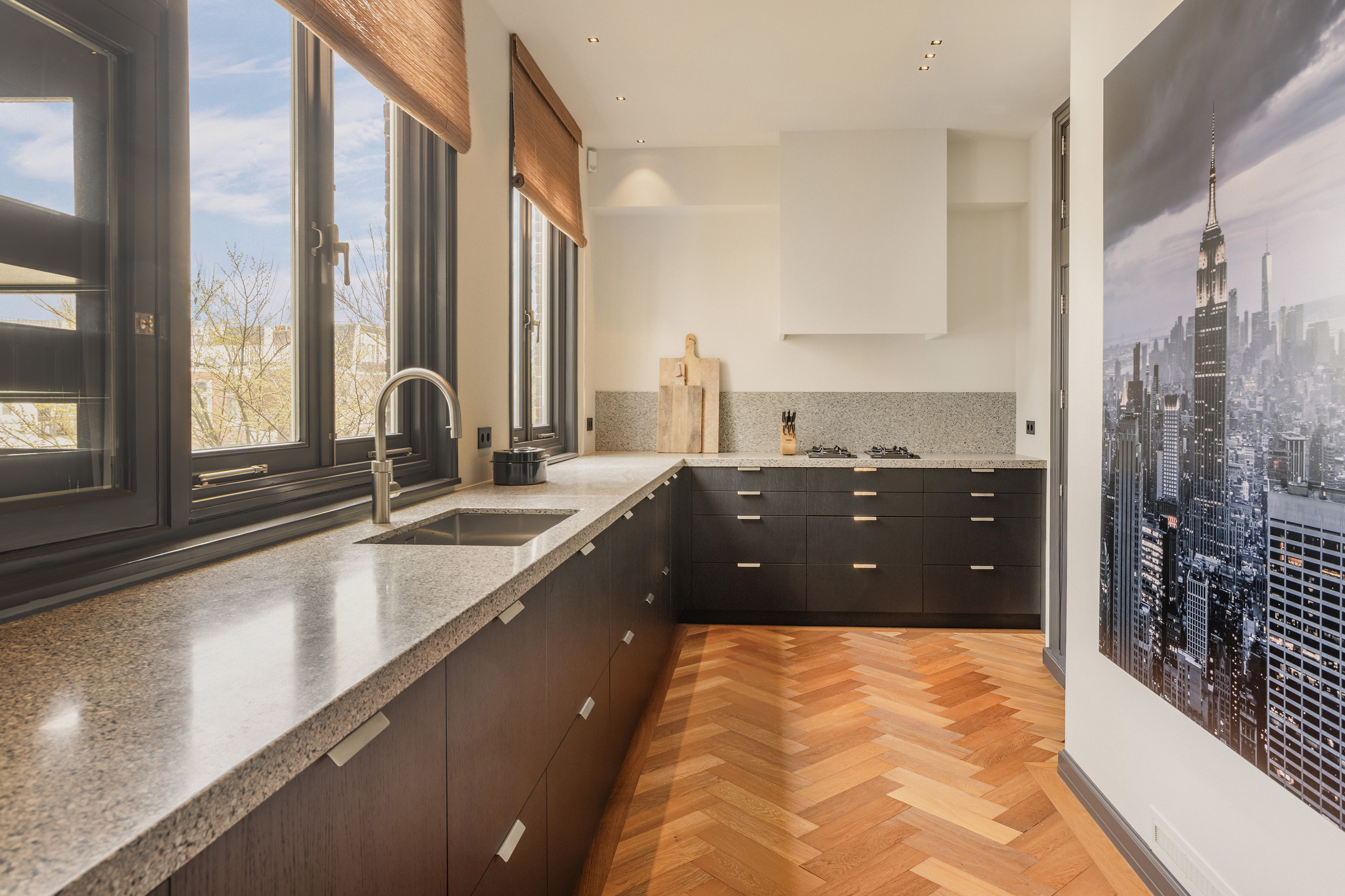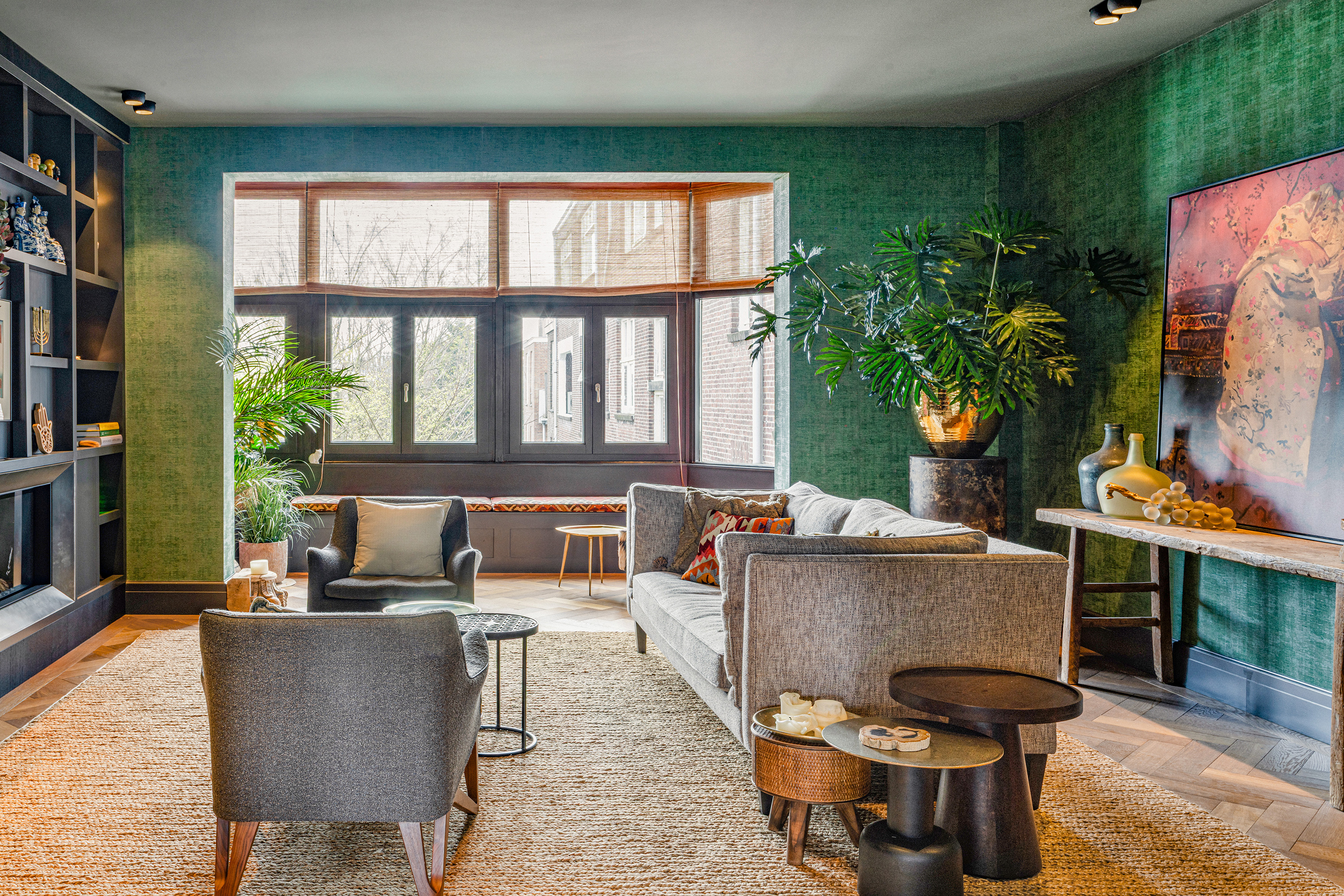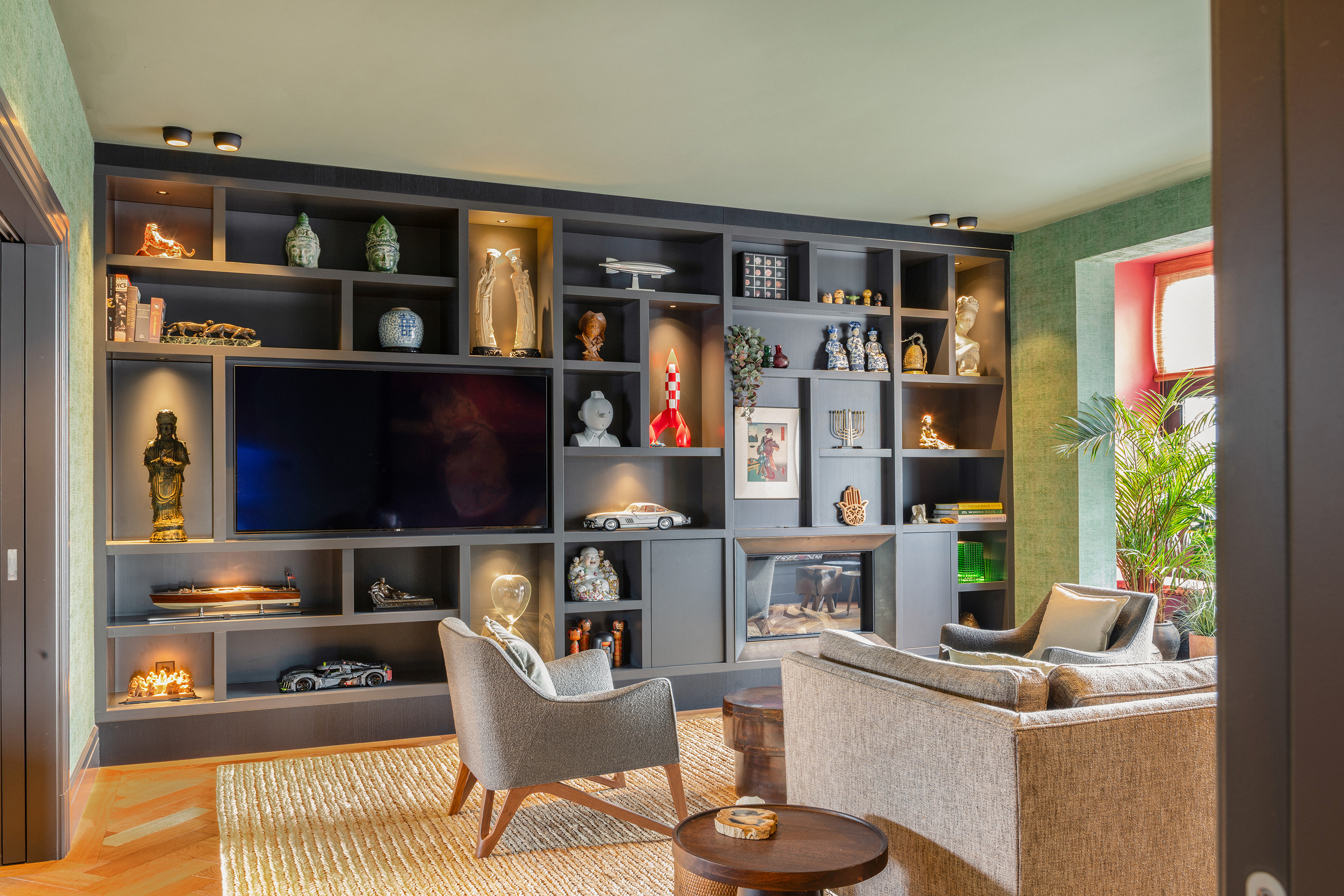 In the living room, bespoke cabinetry and an integrated fireplace create a sense of calm and cohesion. The bay window offers a more intimate seating area, bathed in natural light and overlooking the rhythm of the city.