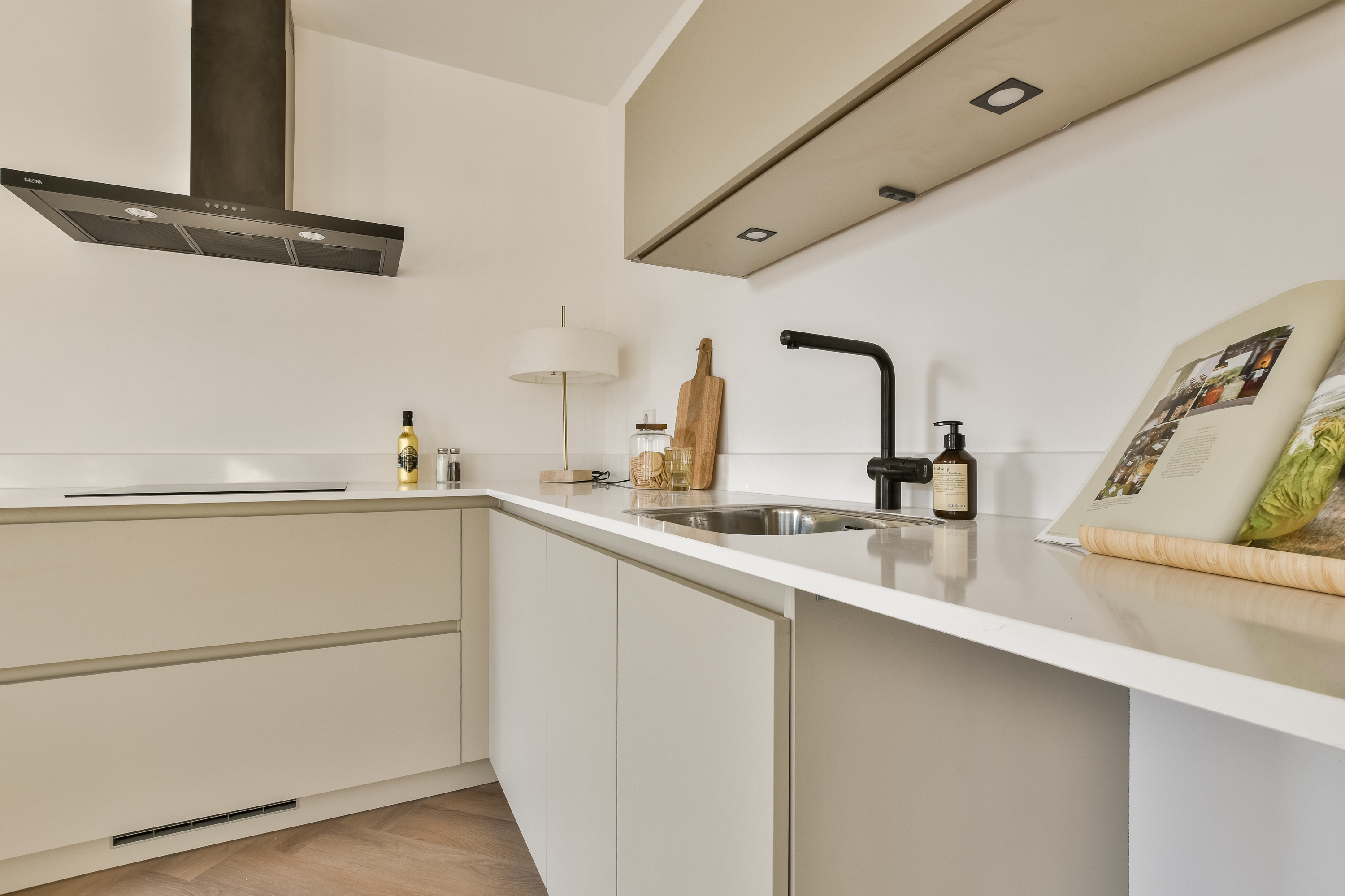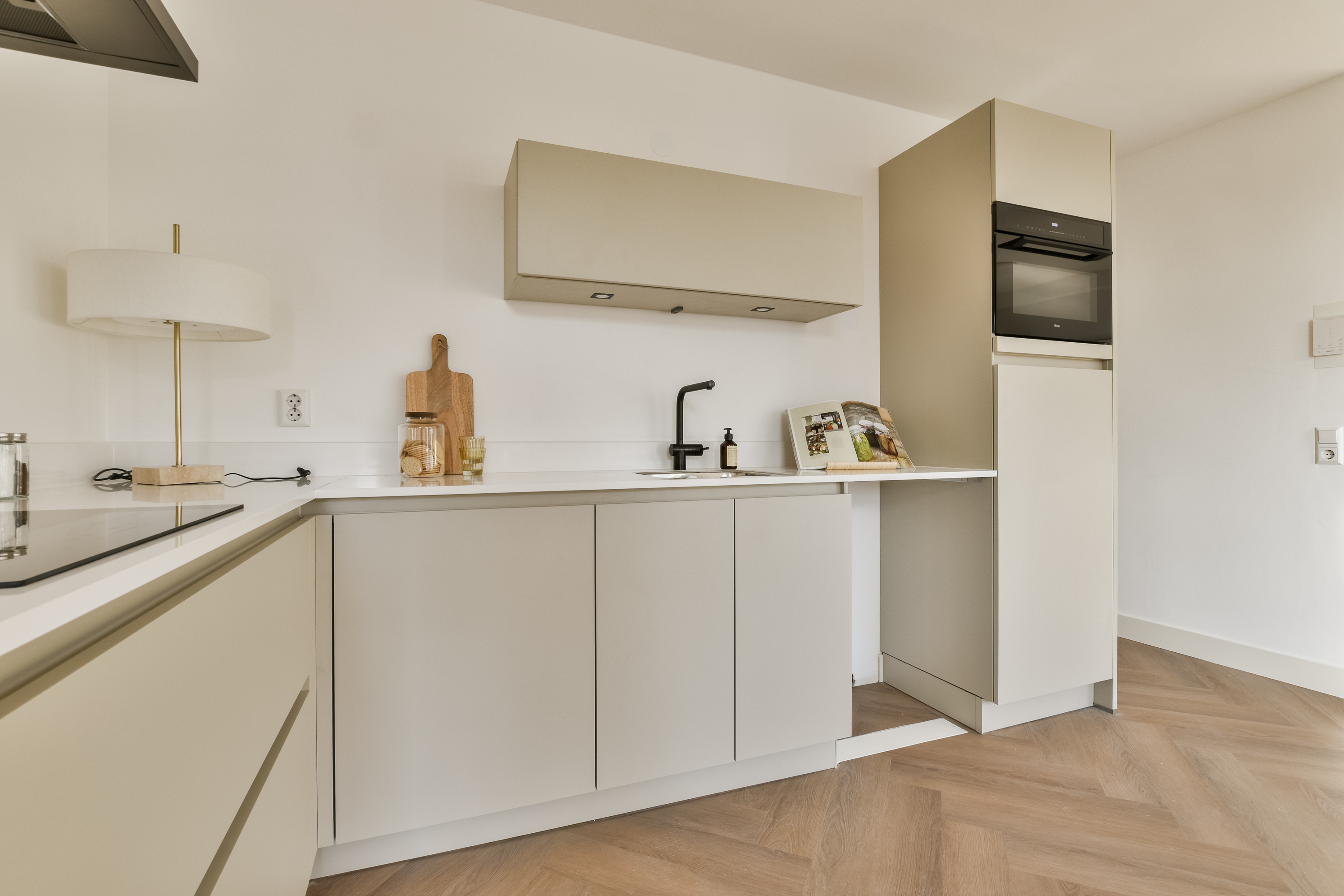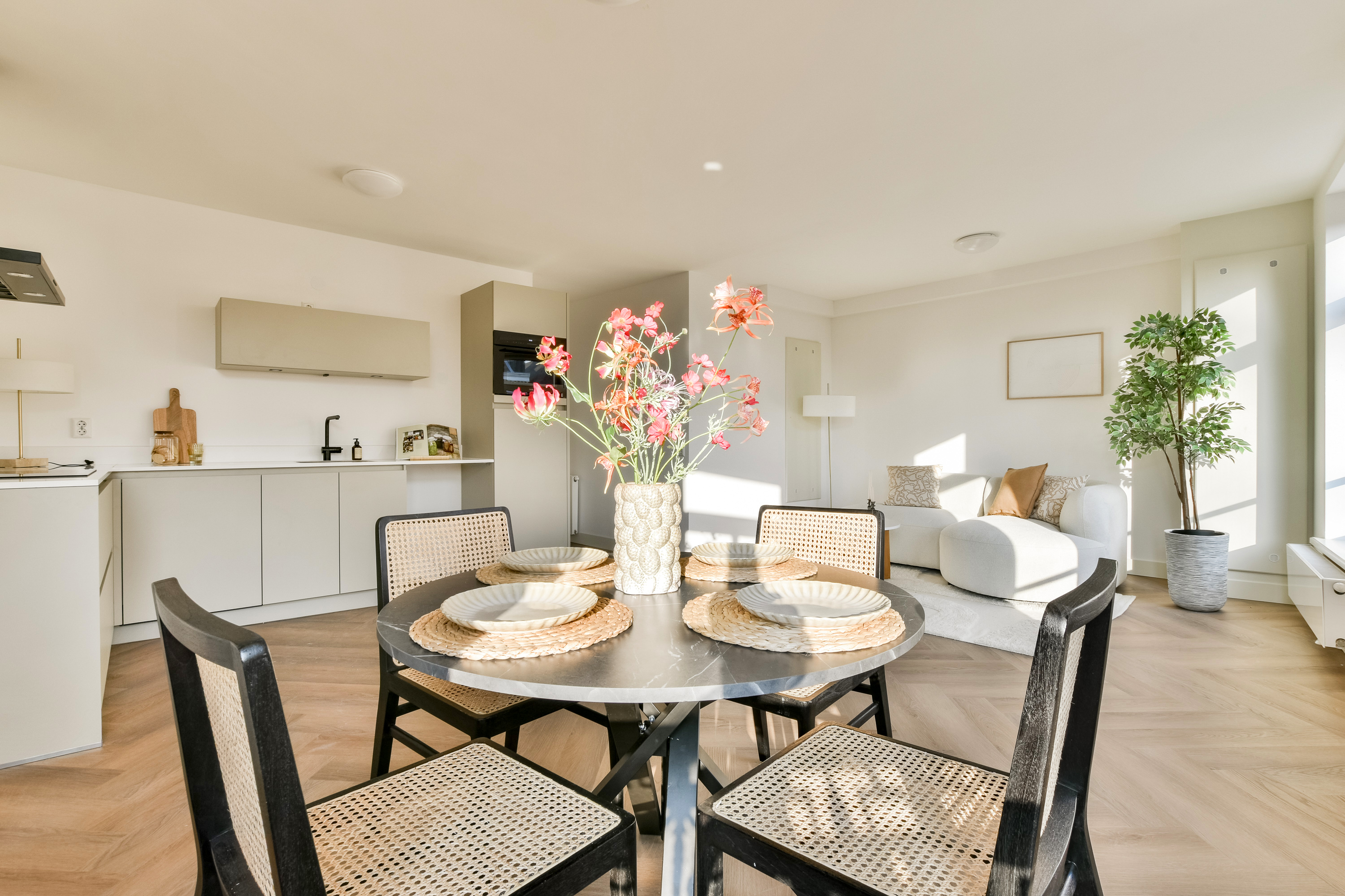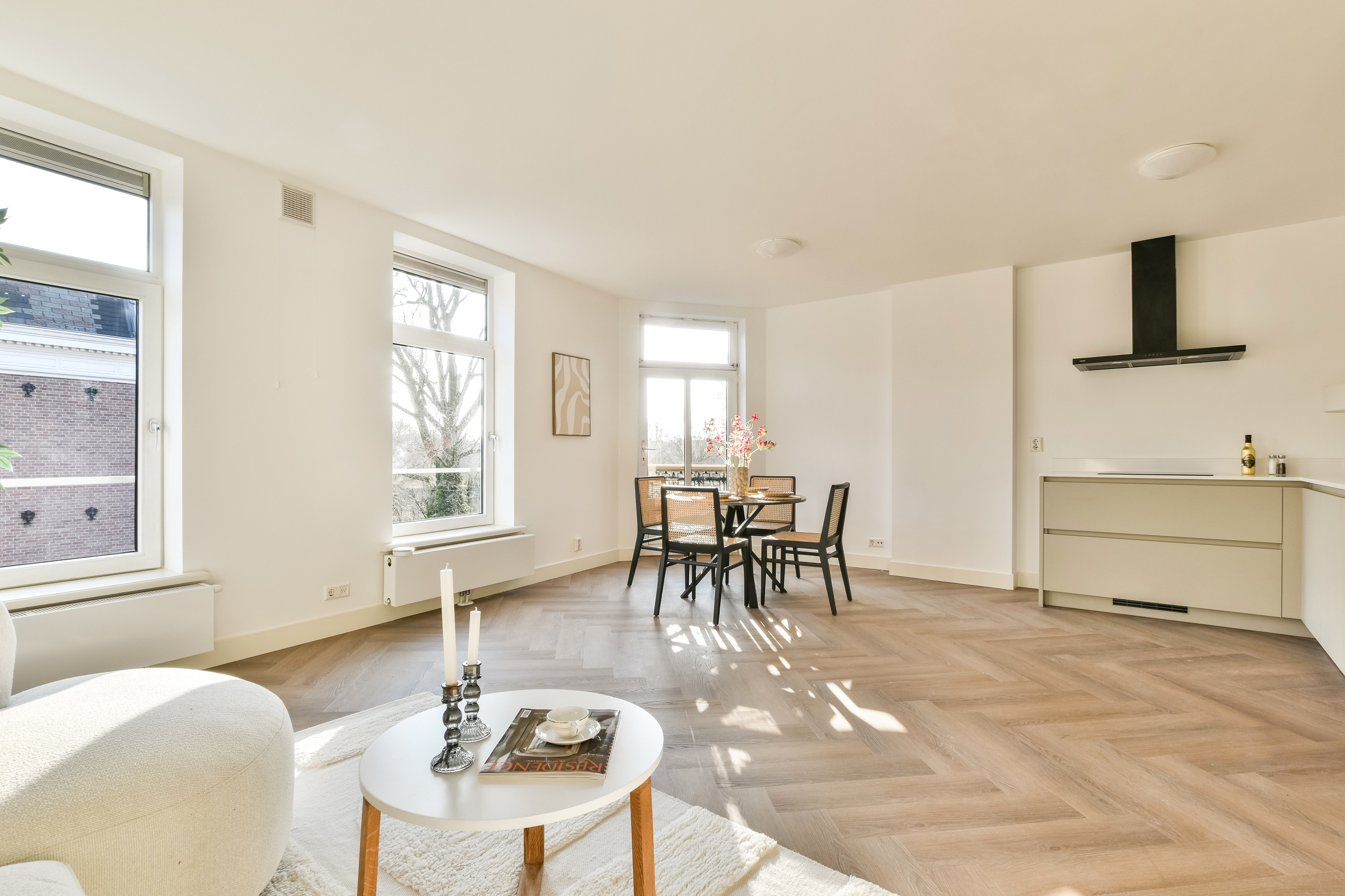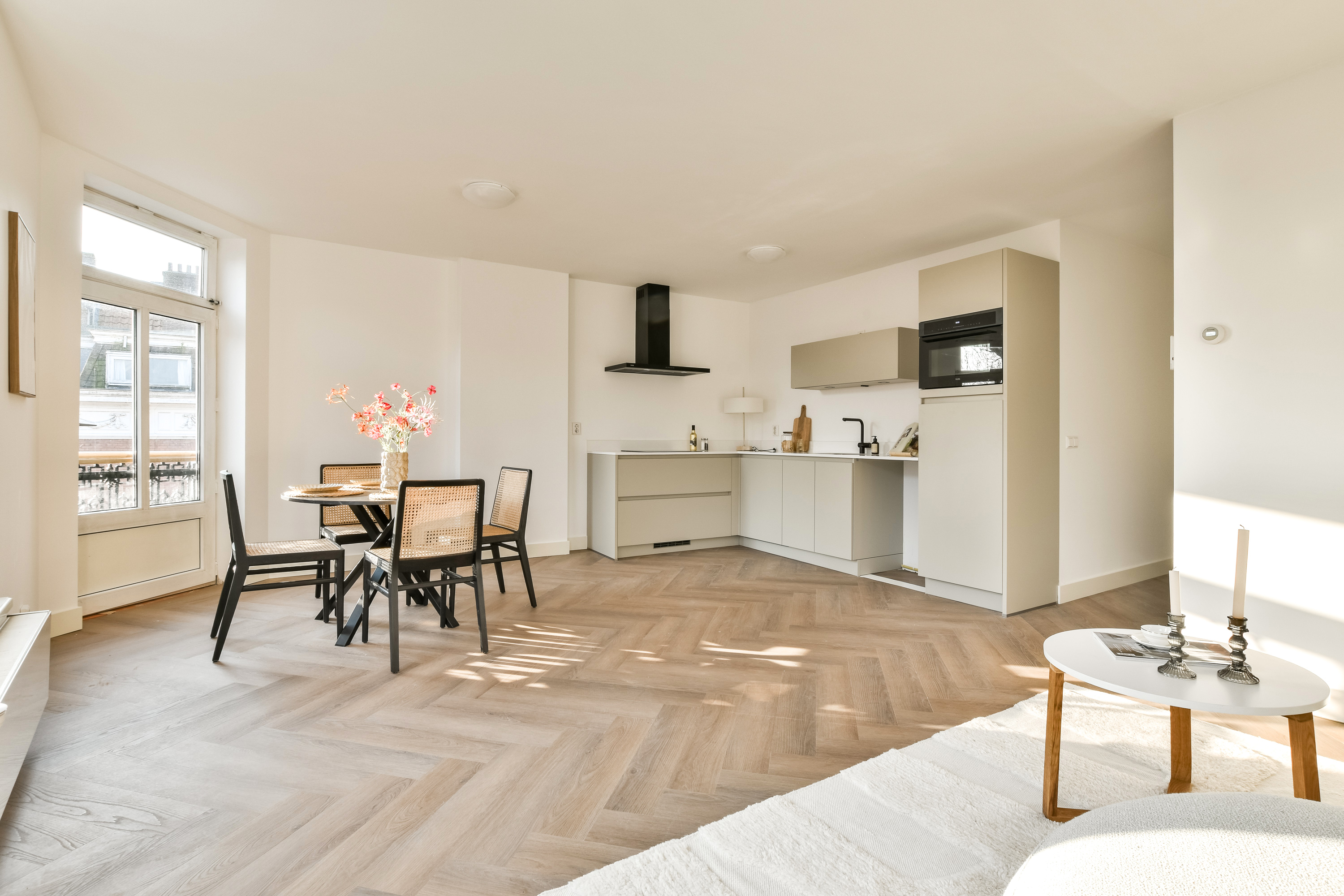De visgraatvloer door de gehele woning verbindt de ruimtes op stijlvolle wijze en zorgt voor een warme, tijdloze uitstraling.