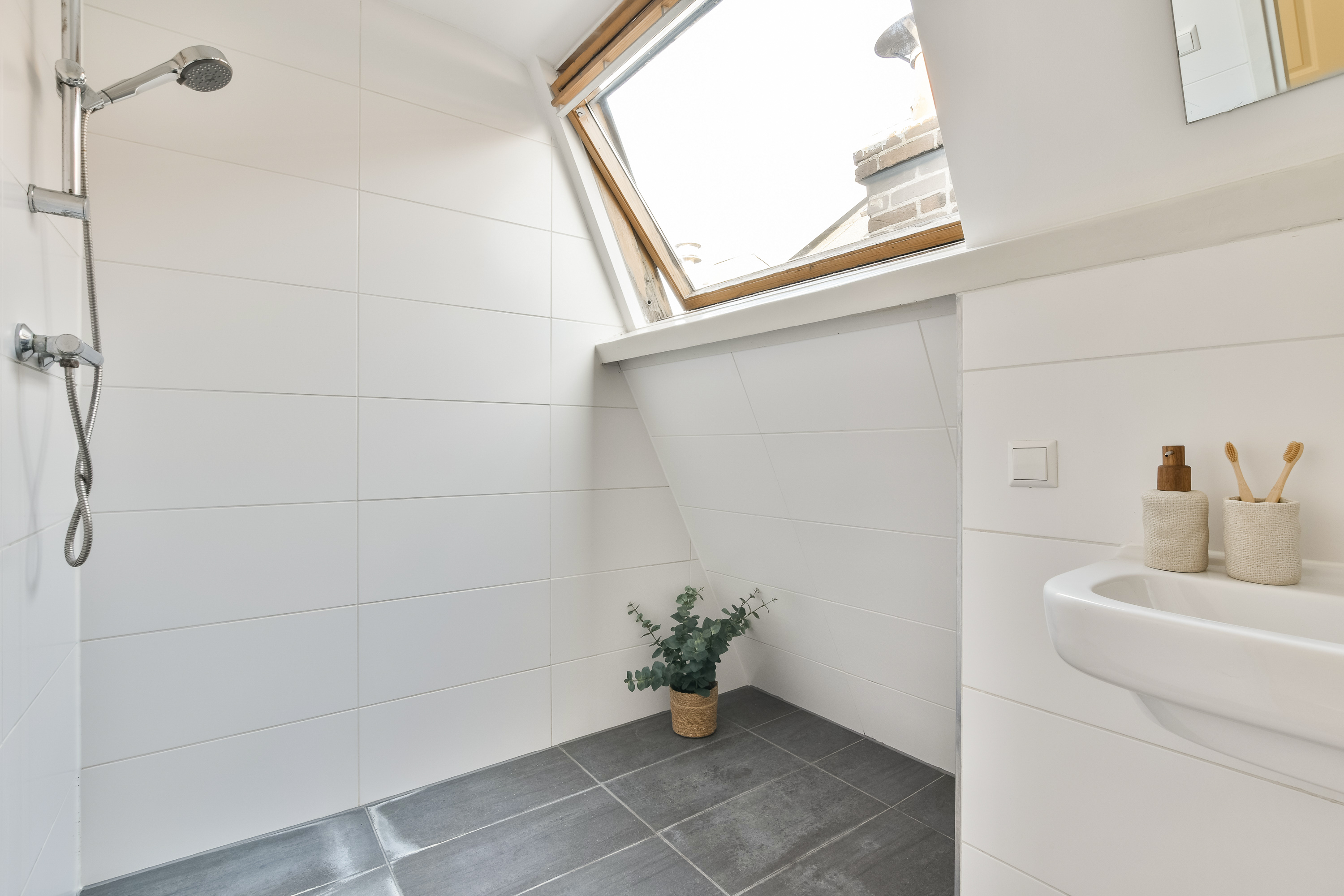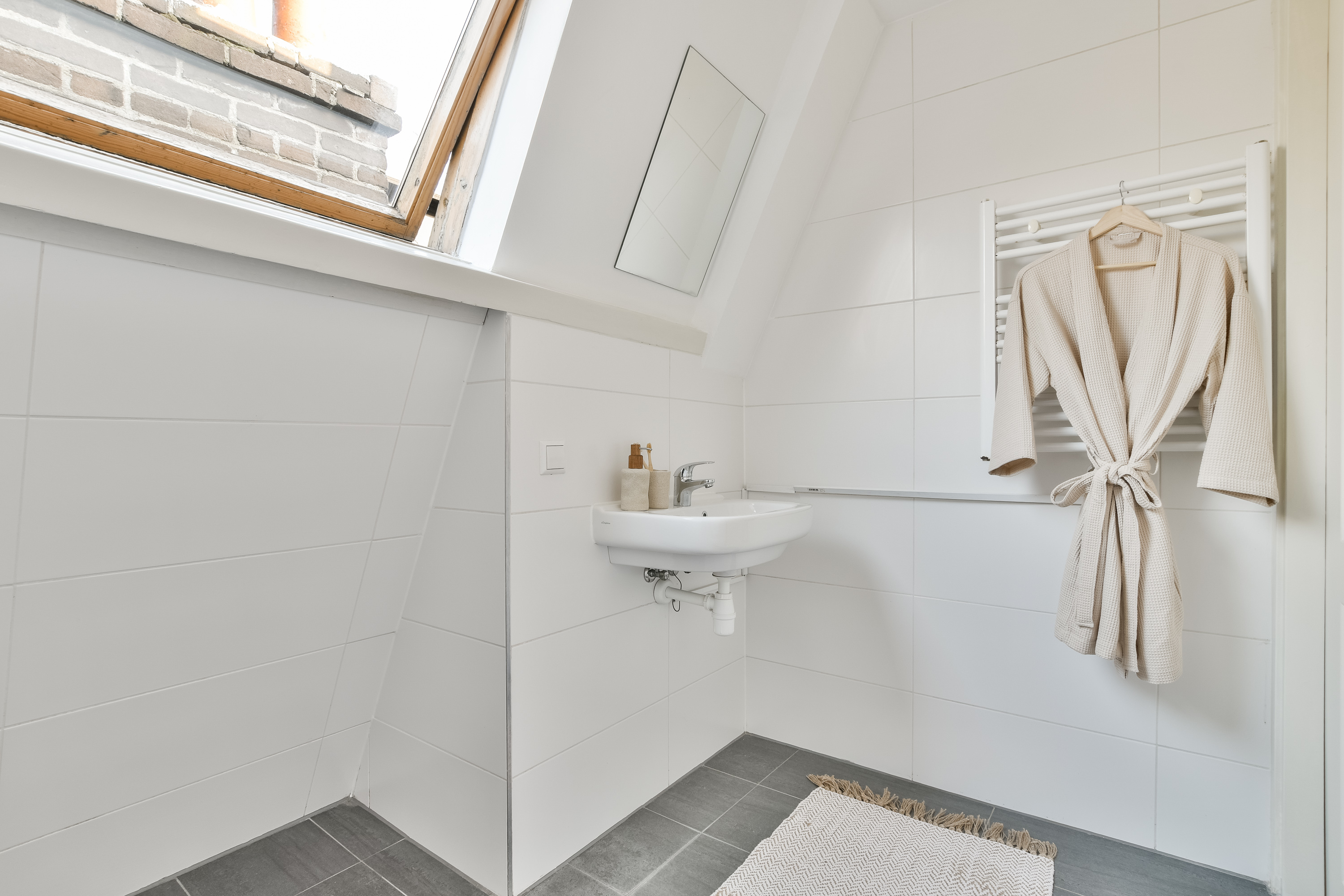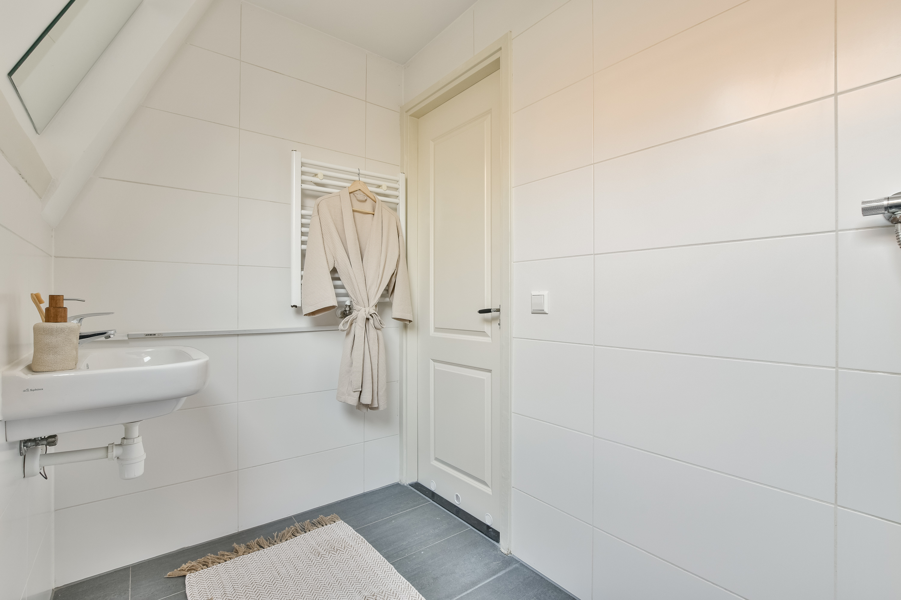 De badkamer is modern uitgevoerd met een inloopdouche, zwevend toilet, wastafelmeubel met spiegelkast en handdoekenradiator.