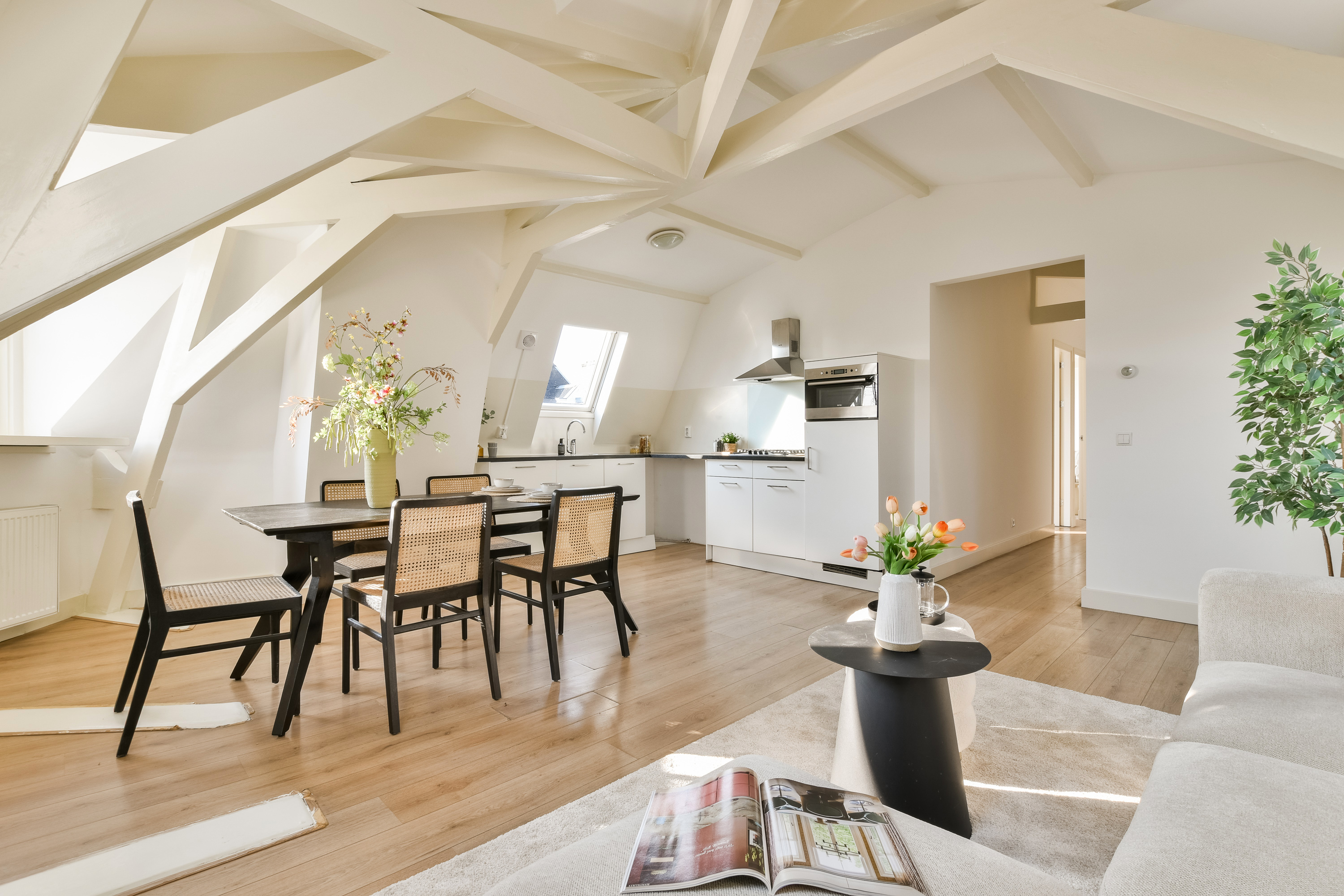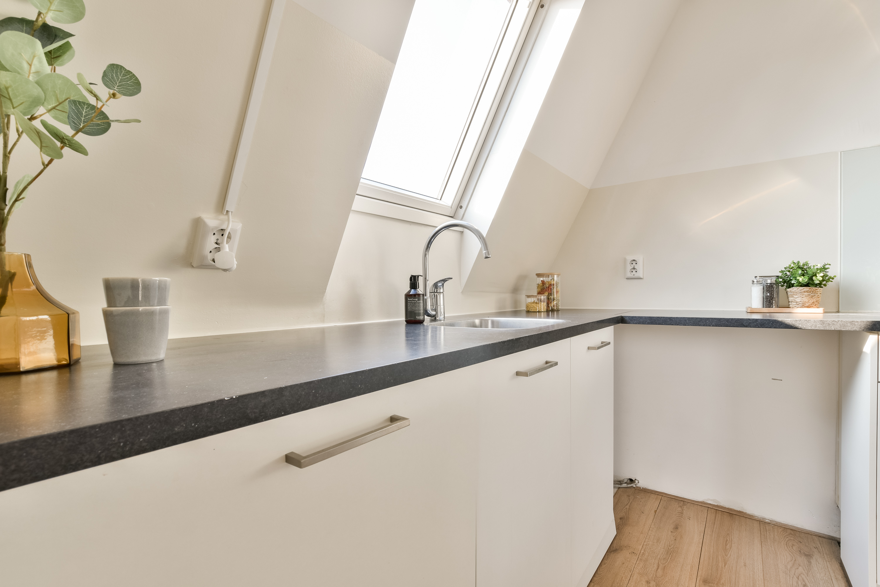 De hal biedt toegang tot alle vertrekken. De lichte woonkeuken ligt prachtig op de hoek, een heerlijke plek om te koken, te eten en met veel licht door de dakramen en ramen van twee verschillende hoeken.