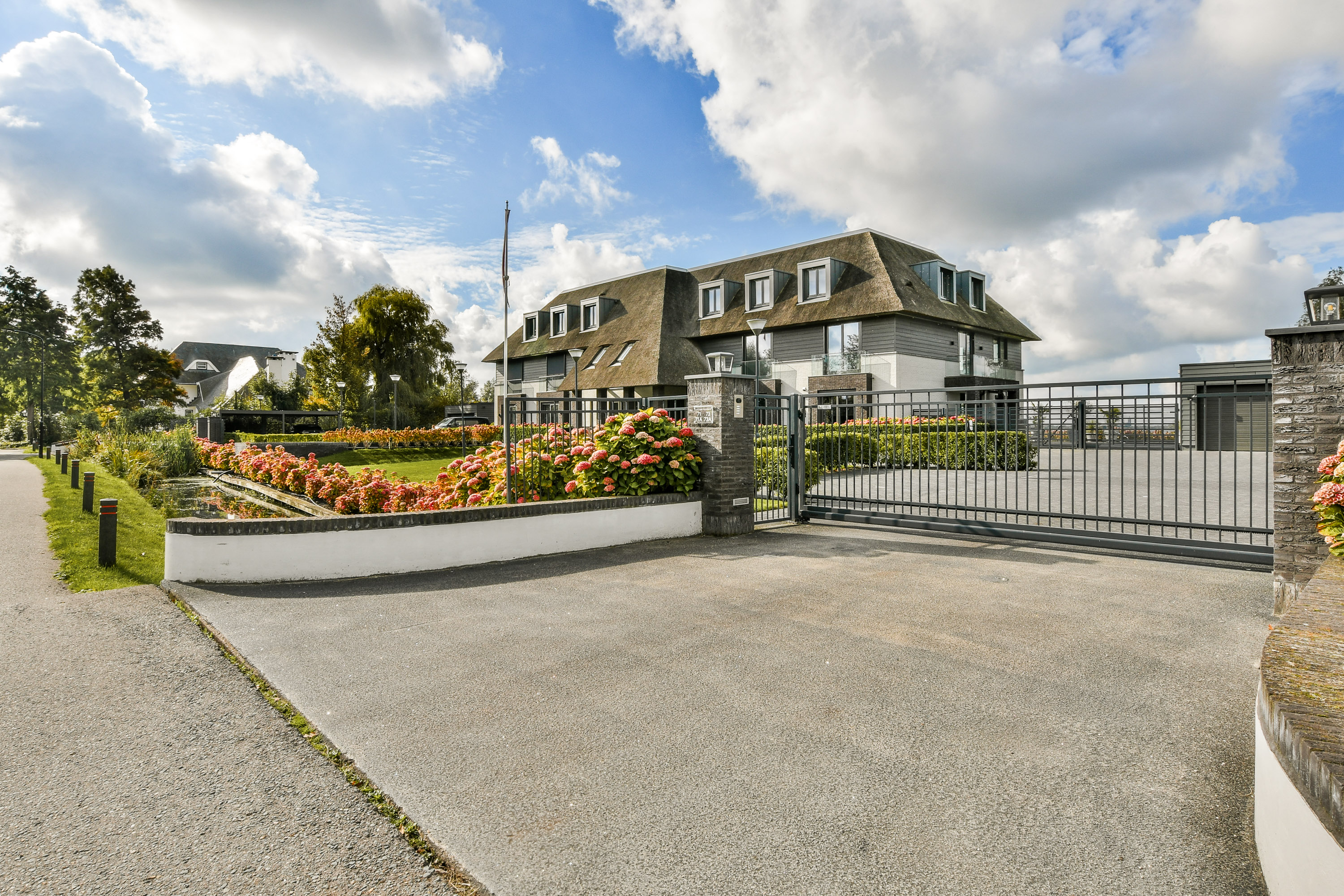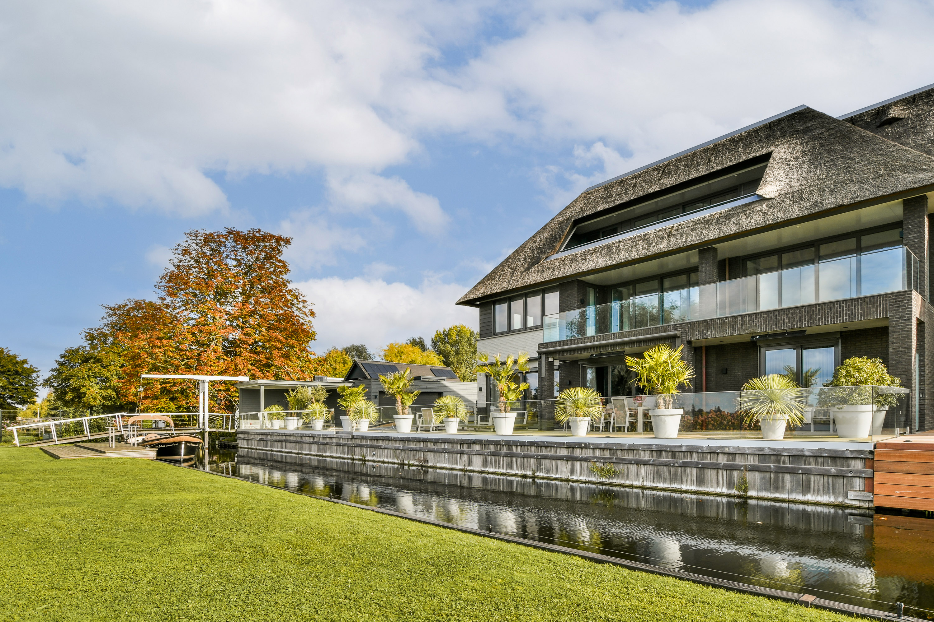 De villa met rieten kap is omgeven door een fraai aangelegde tuin aan zowel de voor- als achterzijde. Via een karakteristieke ophaalbrug bereikt u het bijbehorende eiland in de plas, waar zich de privé-aanlegsteigers bevinden – perfect voor uw sloep, zeilboot of een frisse duik.