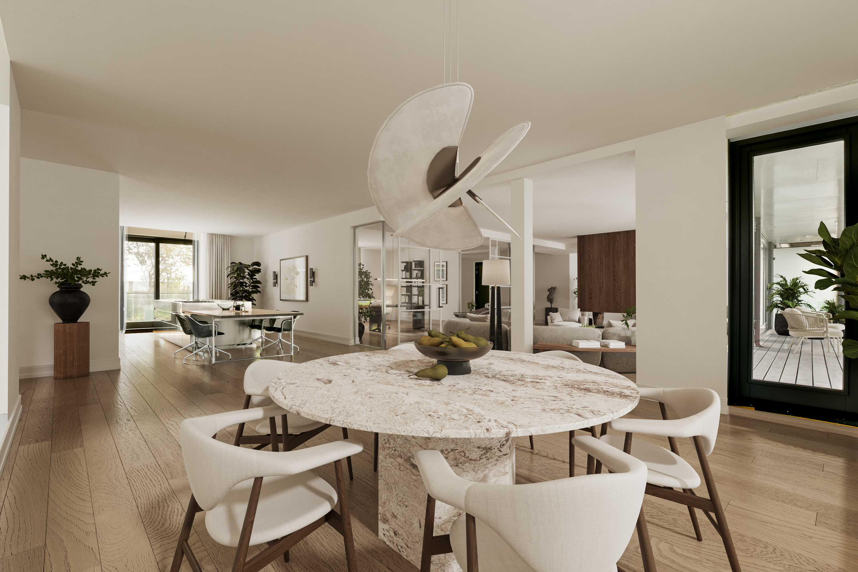 The main area can be arranged as a living, working, or leisure space according to your preference. Two large sliding doors provide access to the terraces.