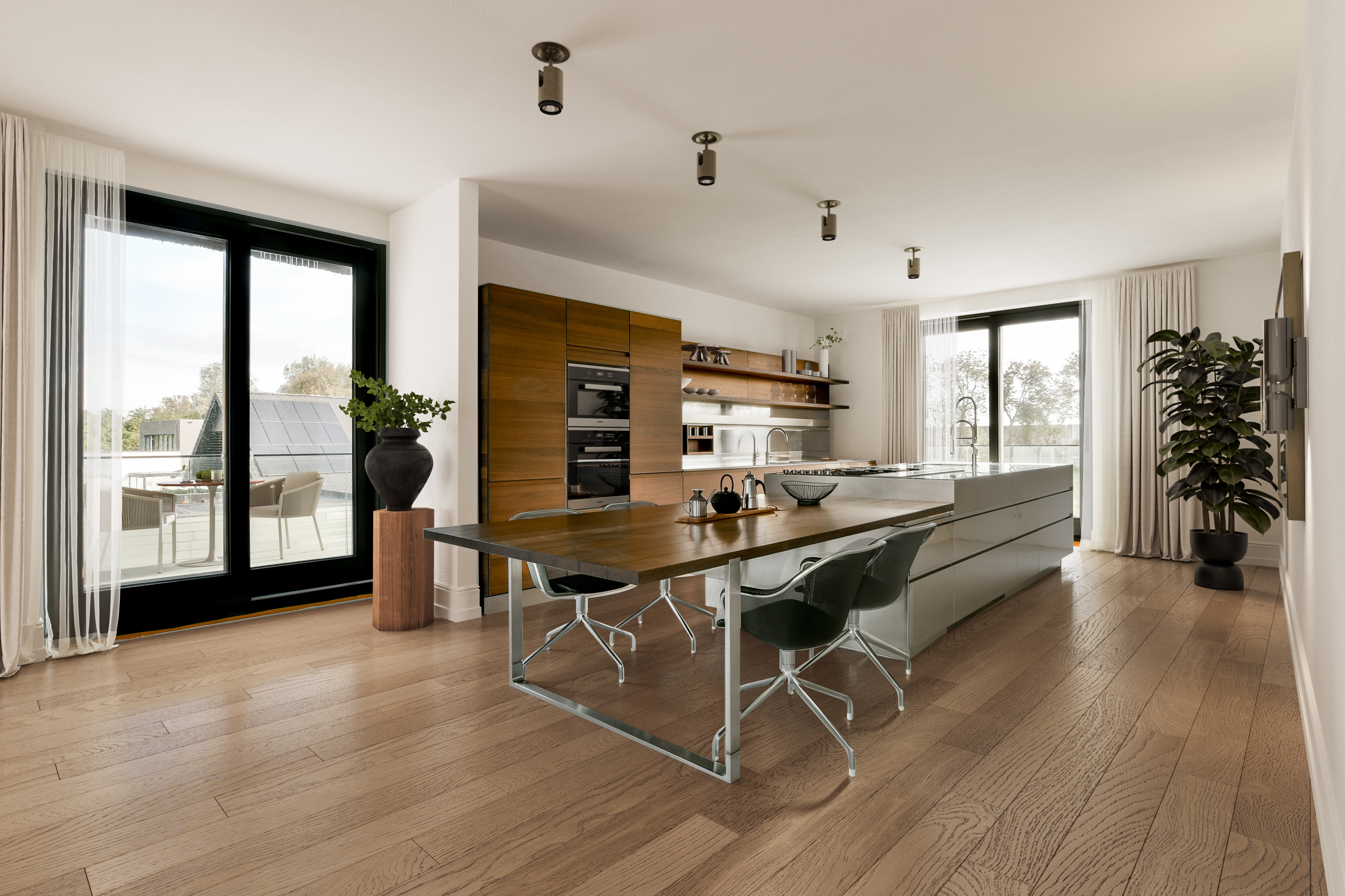 Het appartement is nog geheel naar eigen wens in te delen en af te werken. De royale open leefruimte met keuken biedt talloze mogelijkheden: een aparte werkruimte, loungehoek of eetkamer – de indeling kiest u zelf.