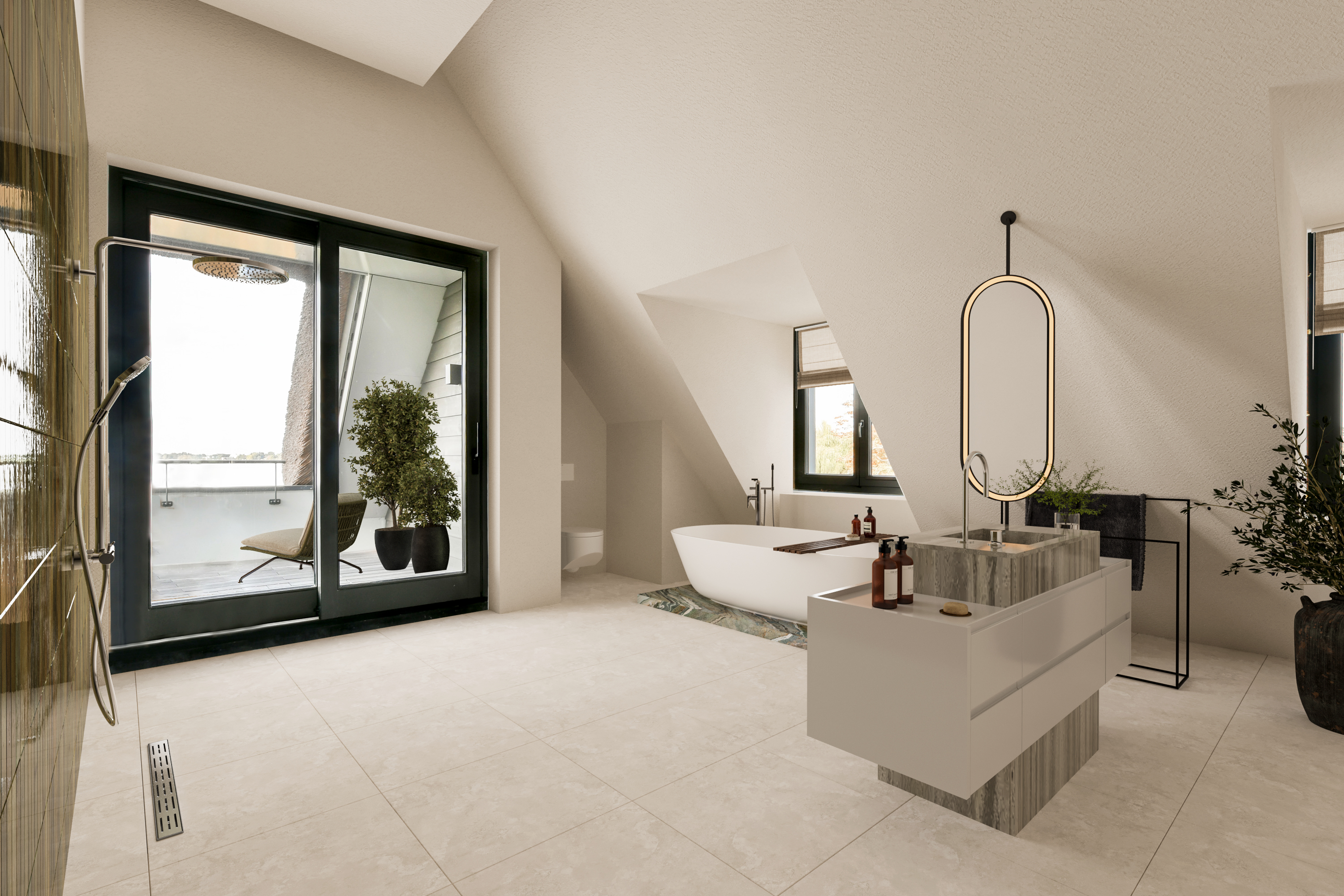 De badkamer is voorbereid voor een inloopdouche, ligbad, dubbele wastafel en derde toilet.