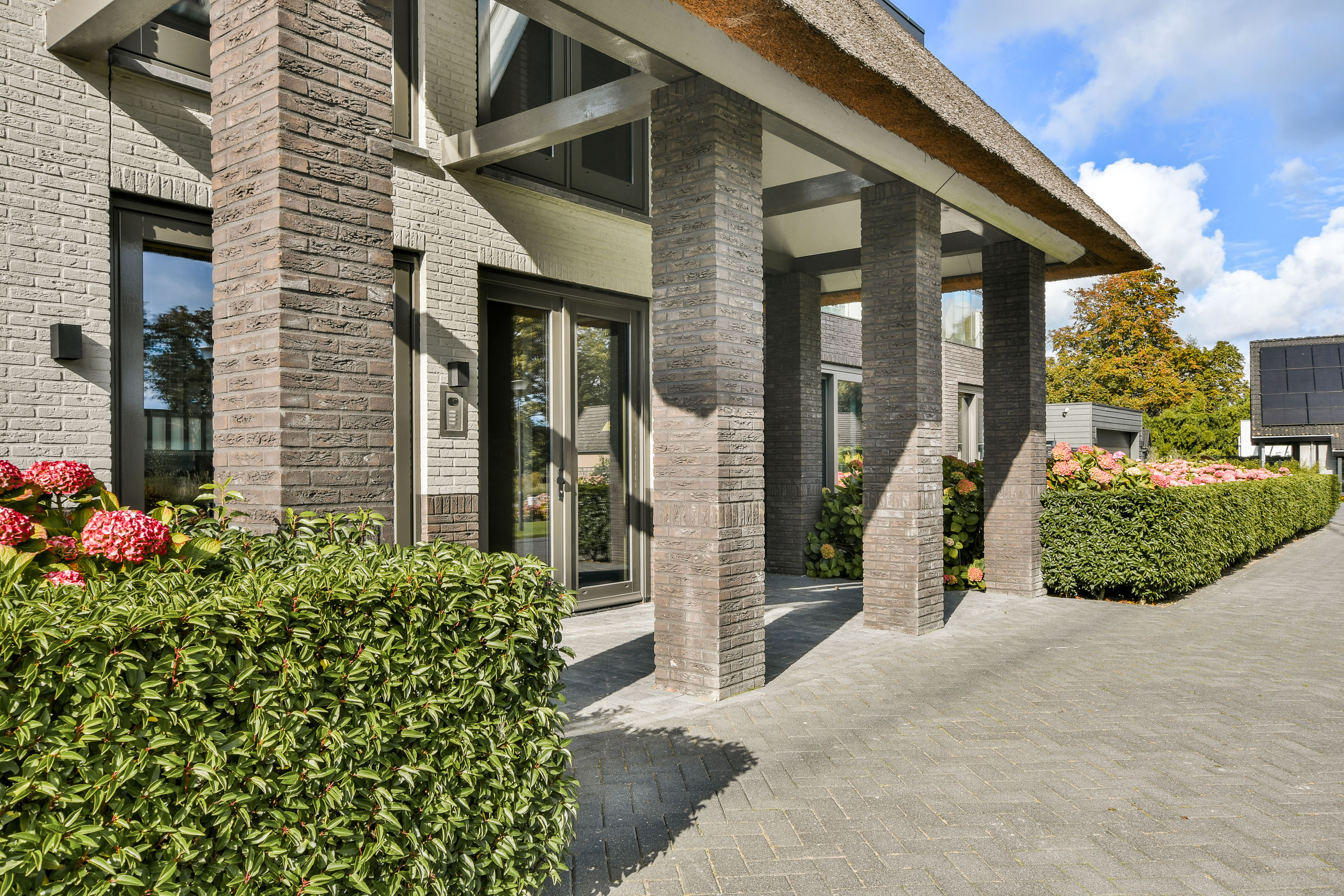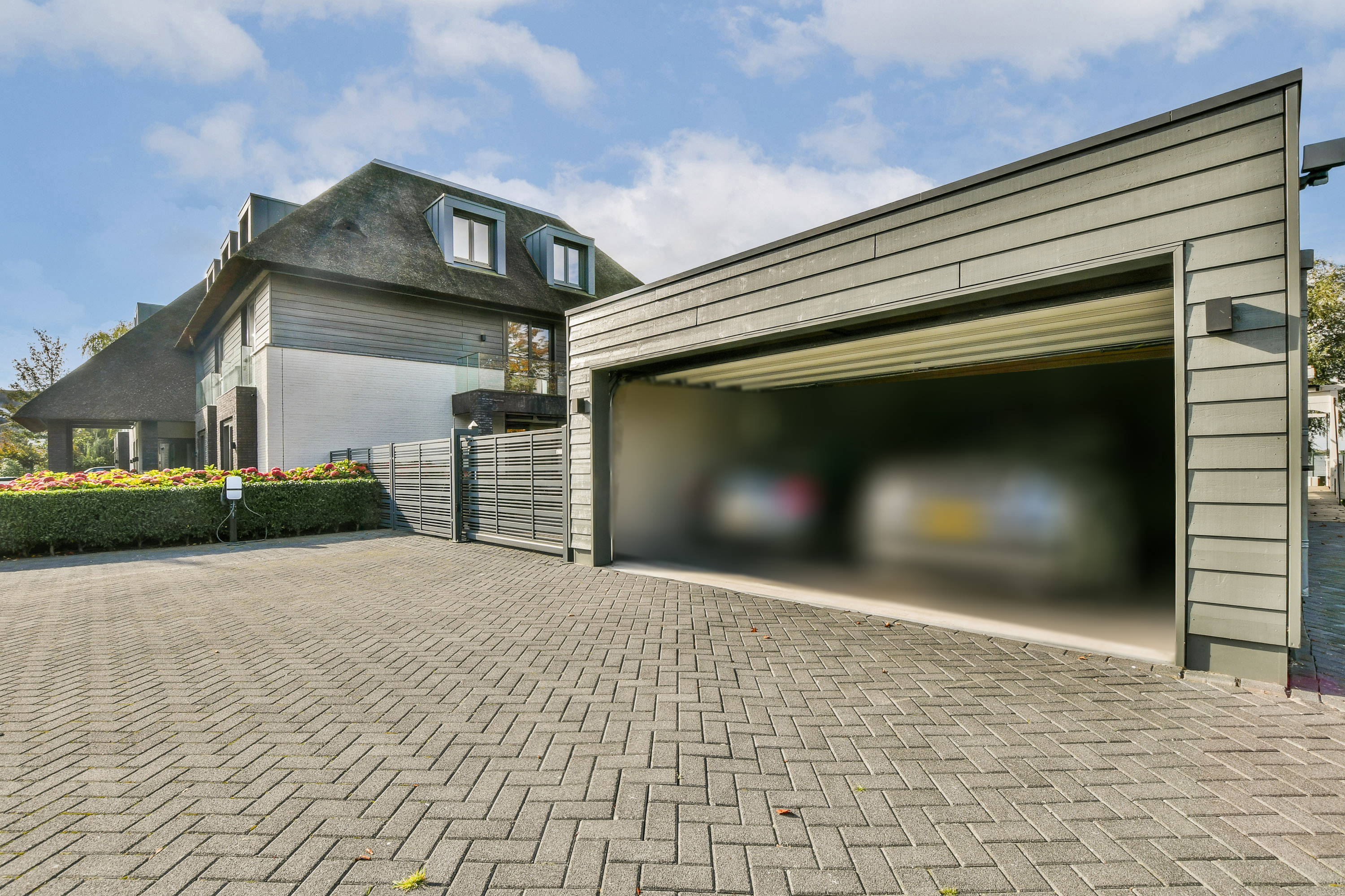 Het terrein van circa 9.600 m² is volledig omheind en voorzien van twee op afstand bedienbare schuifpoorten. Op eigen terrein beschikt u over een eigen garage voor twee auto’s en een parkeerhaven met drie eigen extra gastenplaatsen.
