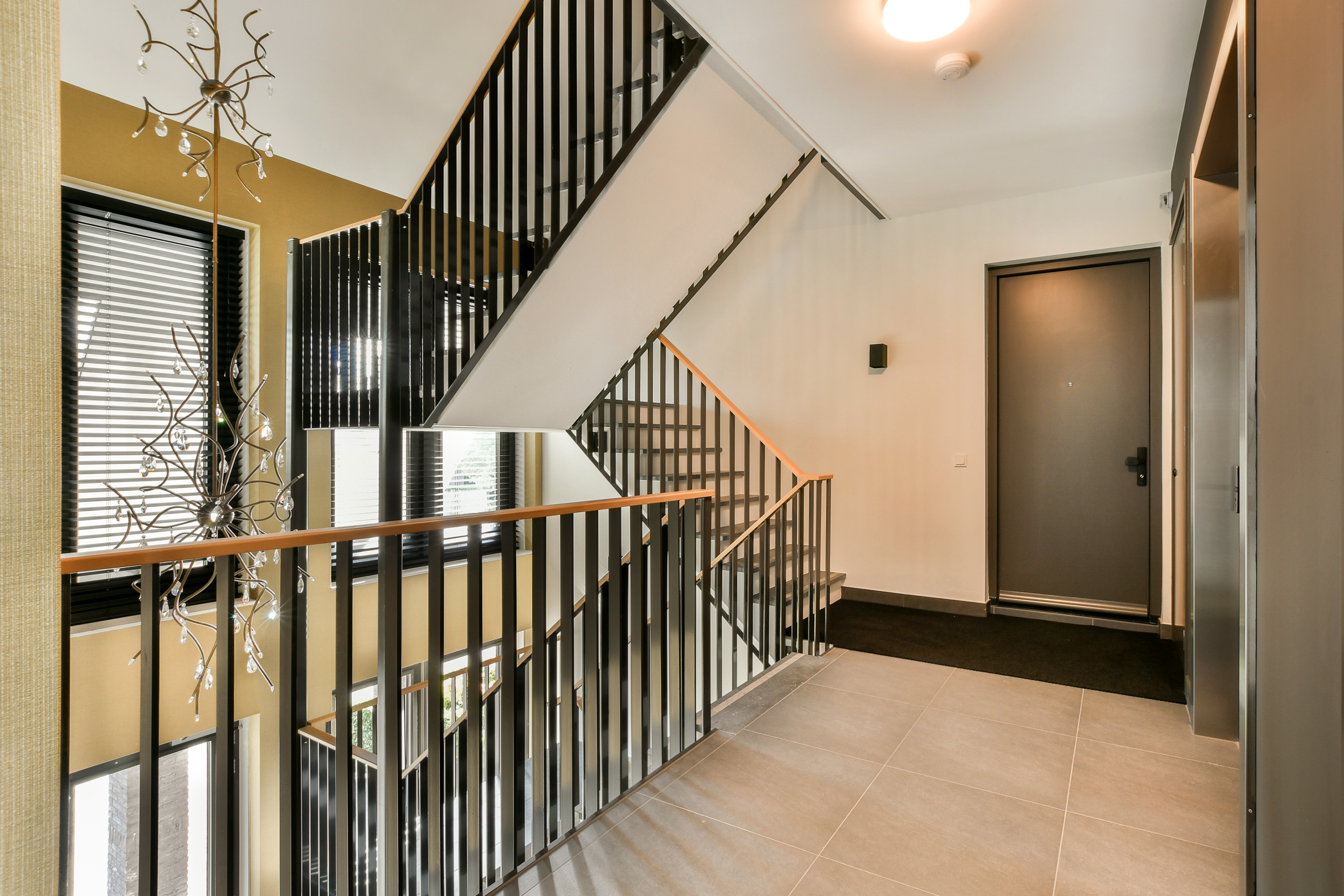Een centrale entree met lift, trap en vide verbindt de verschillende verdiepingen op ruimtelijke wijze met elkaar.