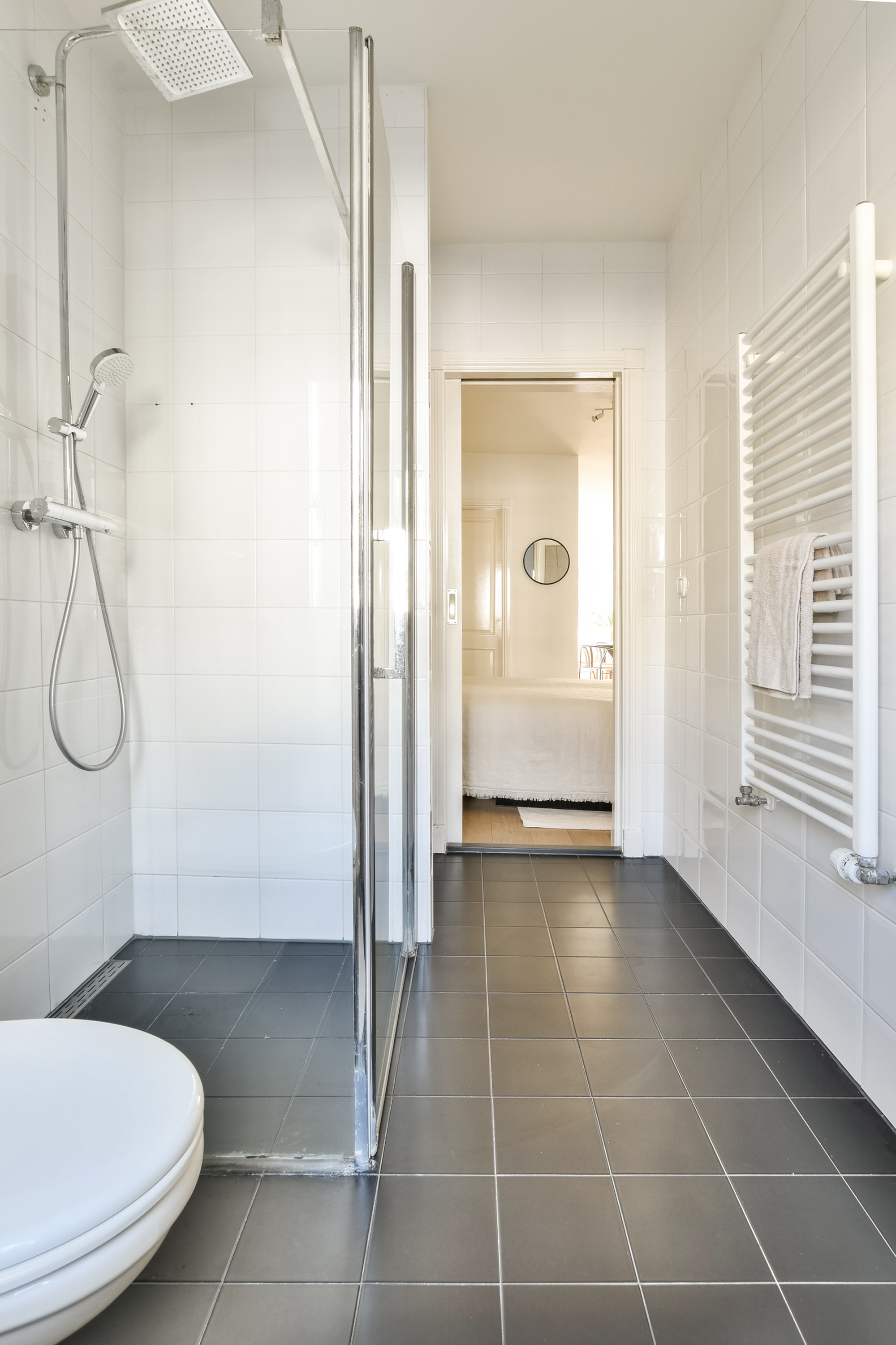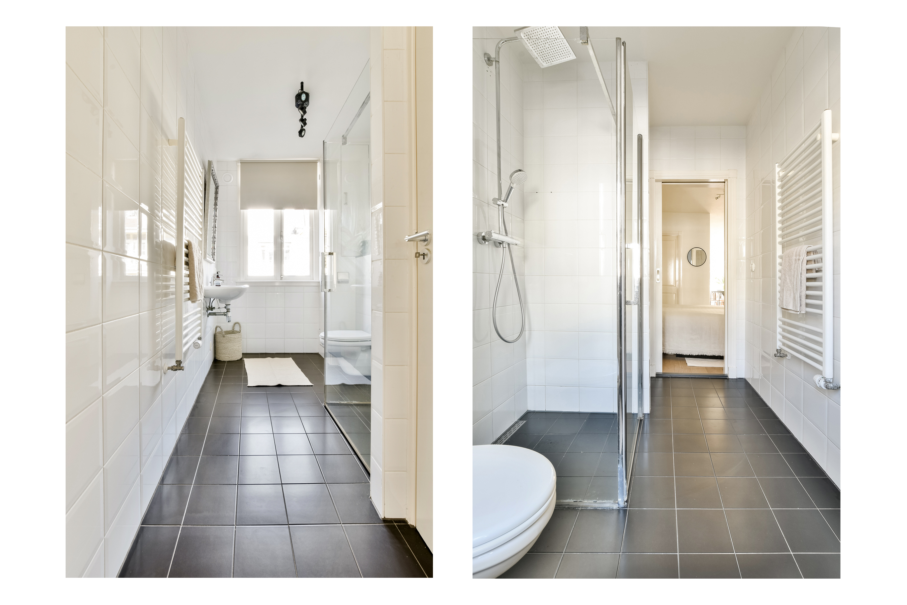 Vanuit de slaapkamer is de badkamer bereikbaar, uitgerust met een douche, wastafel en toilet. In een kast in de badkamer bevindt zich tevens de recent geplaatste (nov 2023) cv-ketel.