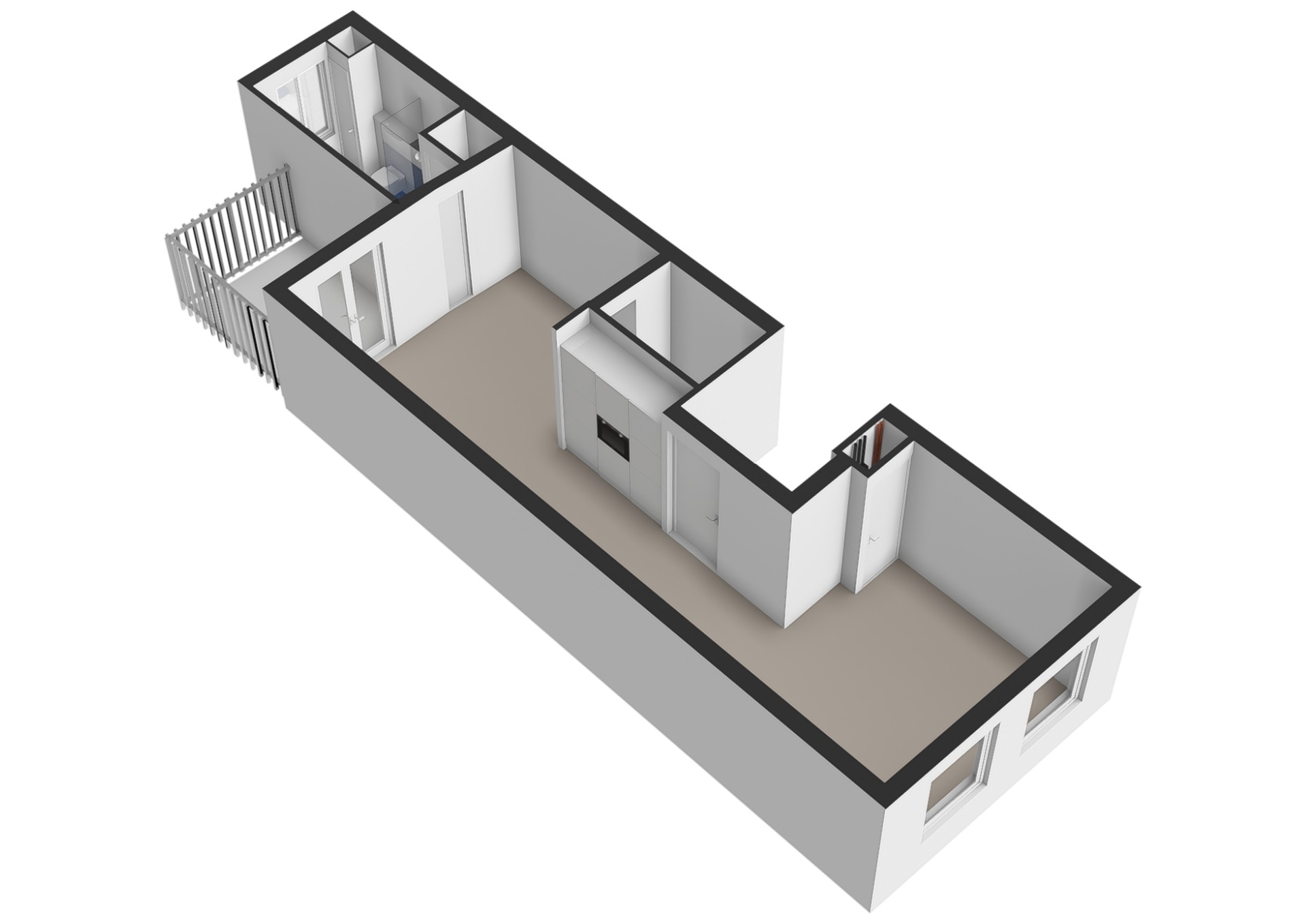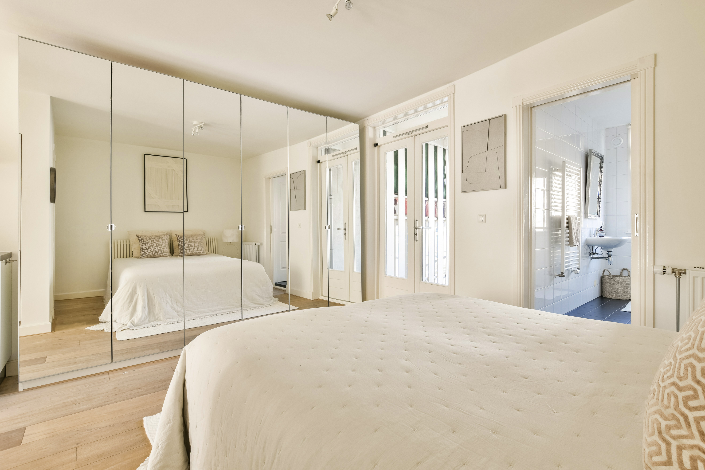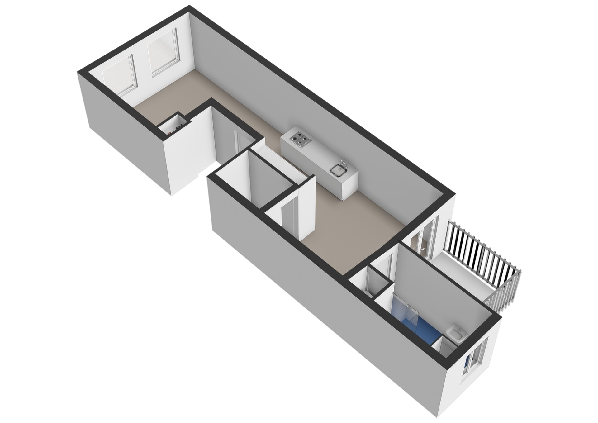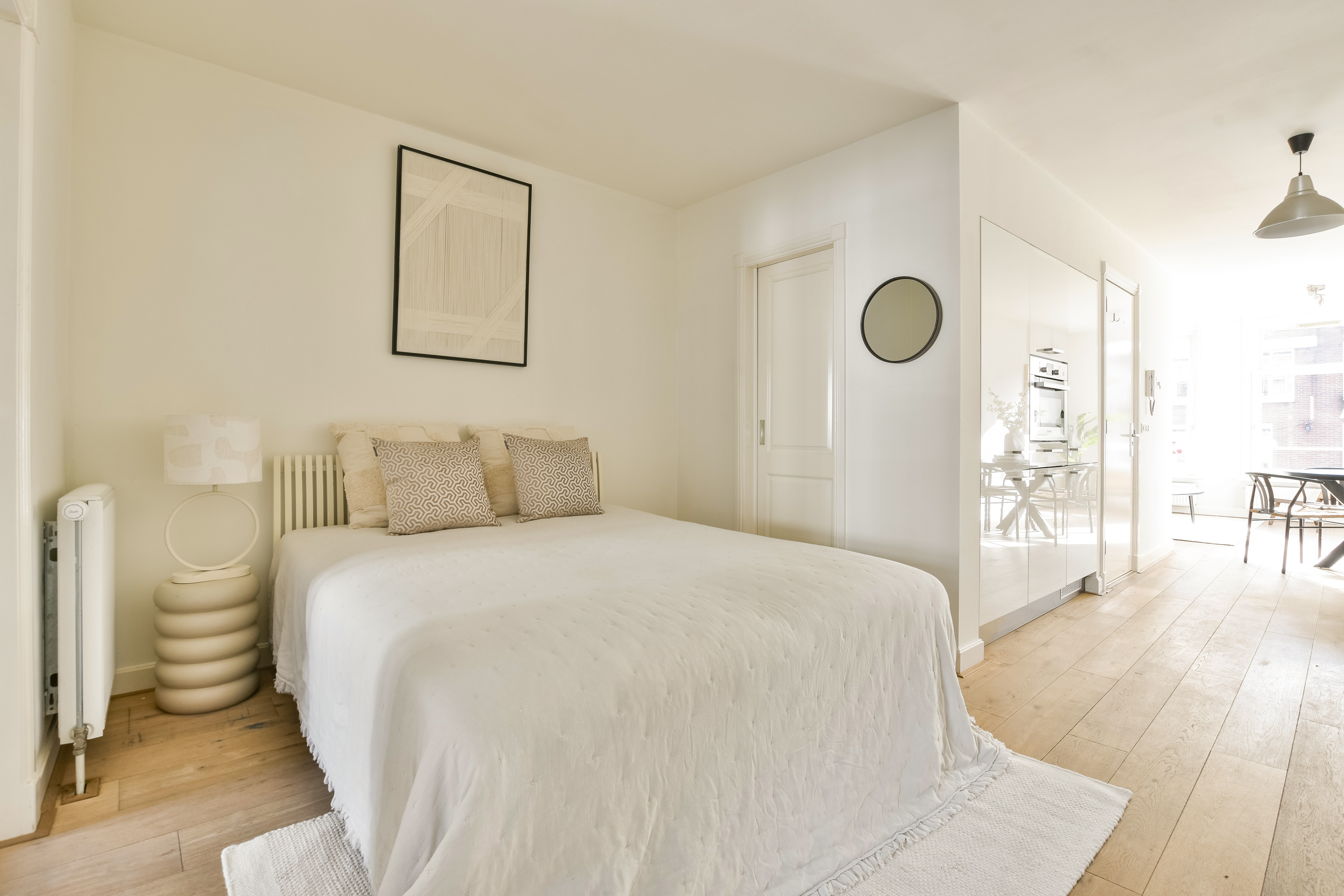 Aan de rustige achterzijde ligt de slaapkamer, voorzien van een grote kast en een ruime inloopkast die tevens geschikt is als werk- of studeerplek. De huidige eigenaar gaf voorkeur aan een open indeling; de slaapkamer is eenvoudig af te splitsen van de woonruimte door een glazen pui / tussenwandje indien gewenst.