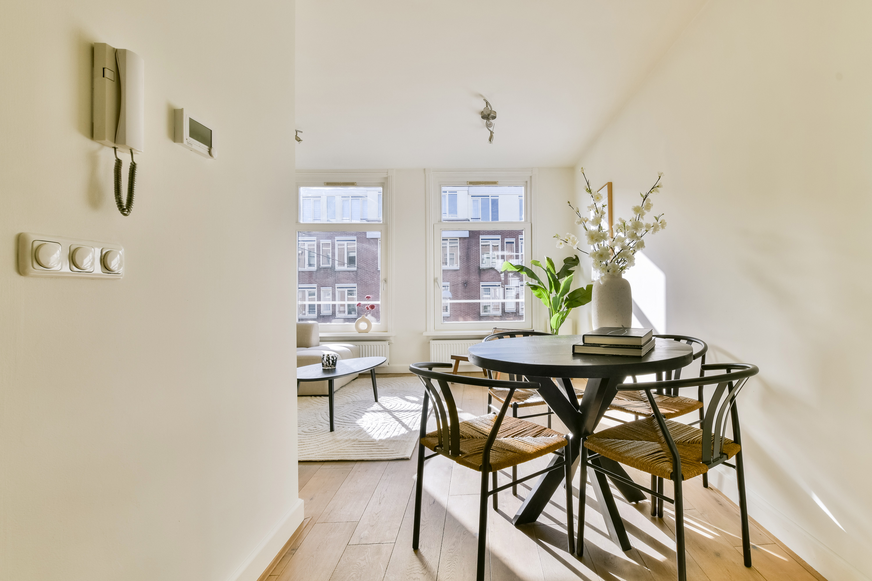 At the front of the apartment you will find the bright living room with dining area and open kitchen. Large windows facing the street allow plenty of natural daylight to enter the space and offer a lively view over the Kinkerstraat. The well-insulated windows ensure a comfortable and quiet indoor environment.