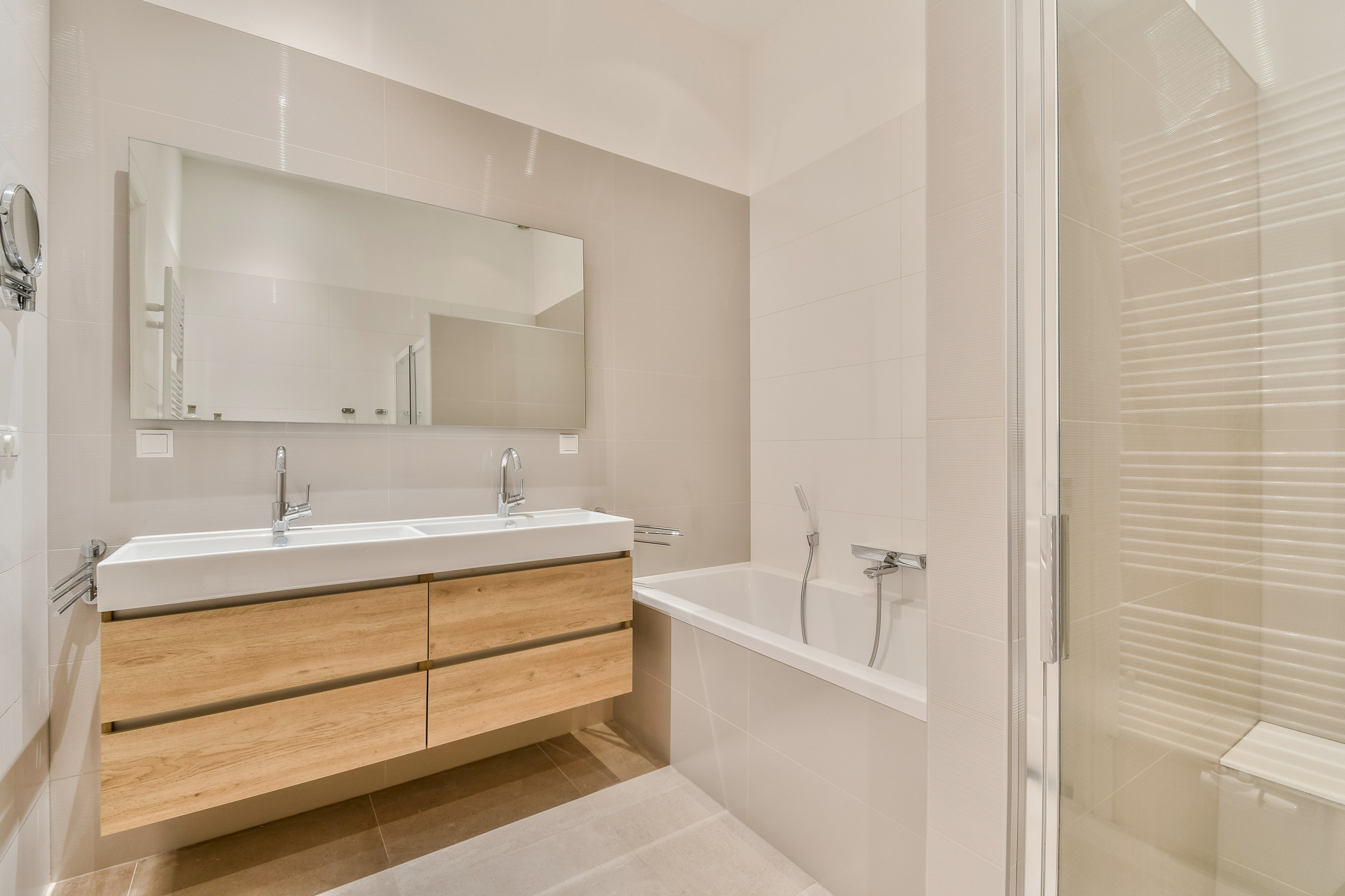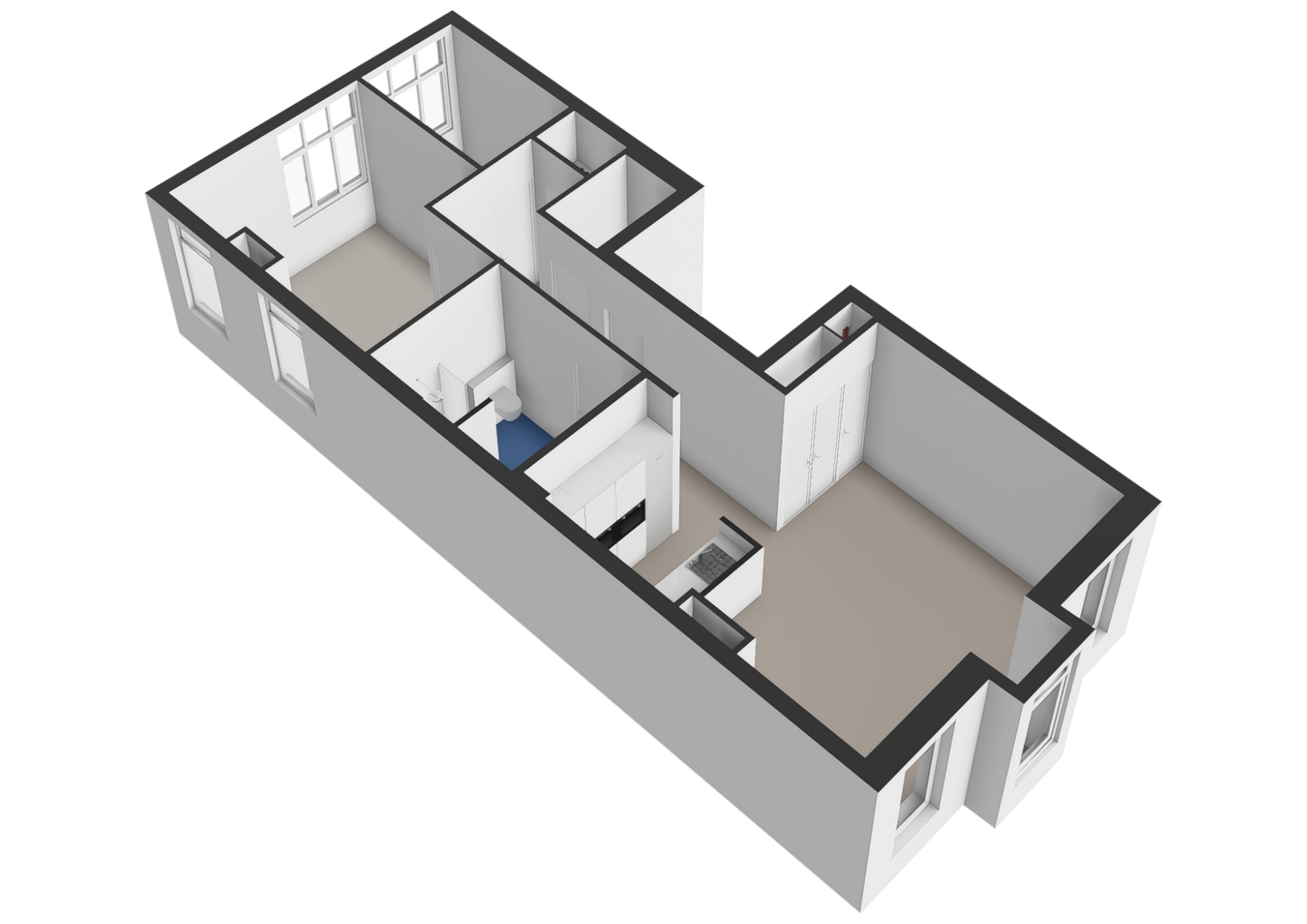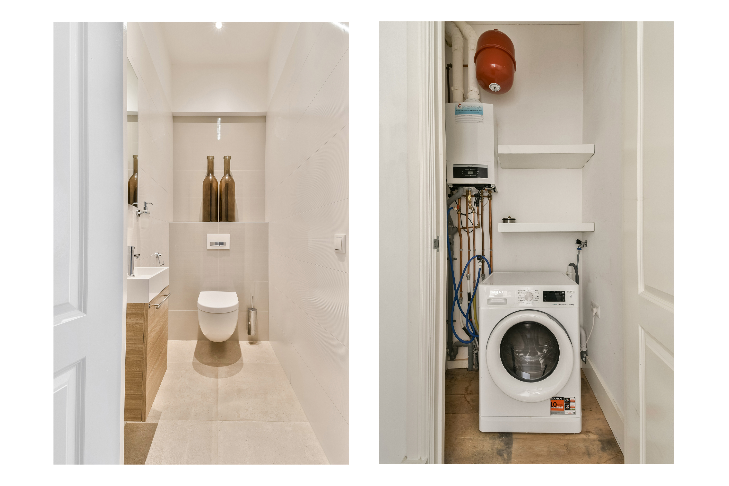 he entrance to the apartment is located on the first floor. Through the hallway, you walk to the front side, where the living room with open kitchen is situated. In the middle of the apartment is the spacious and luxurious bathroom, equipped with a bathtub, double sink, separate shower and a toilet. The hallway also provides access to a second toilet and a built-in cupboard housing the washing machine and central heating system. At the rear of the apartment, there is one large and one smaller bedroom.