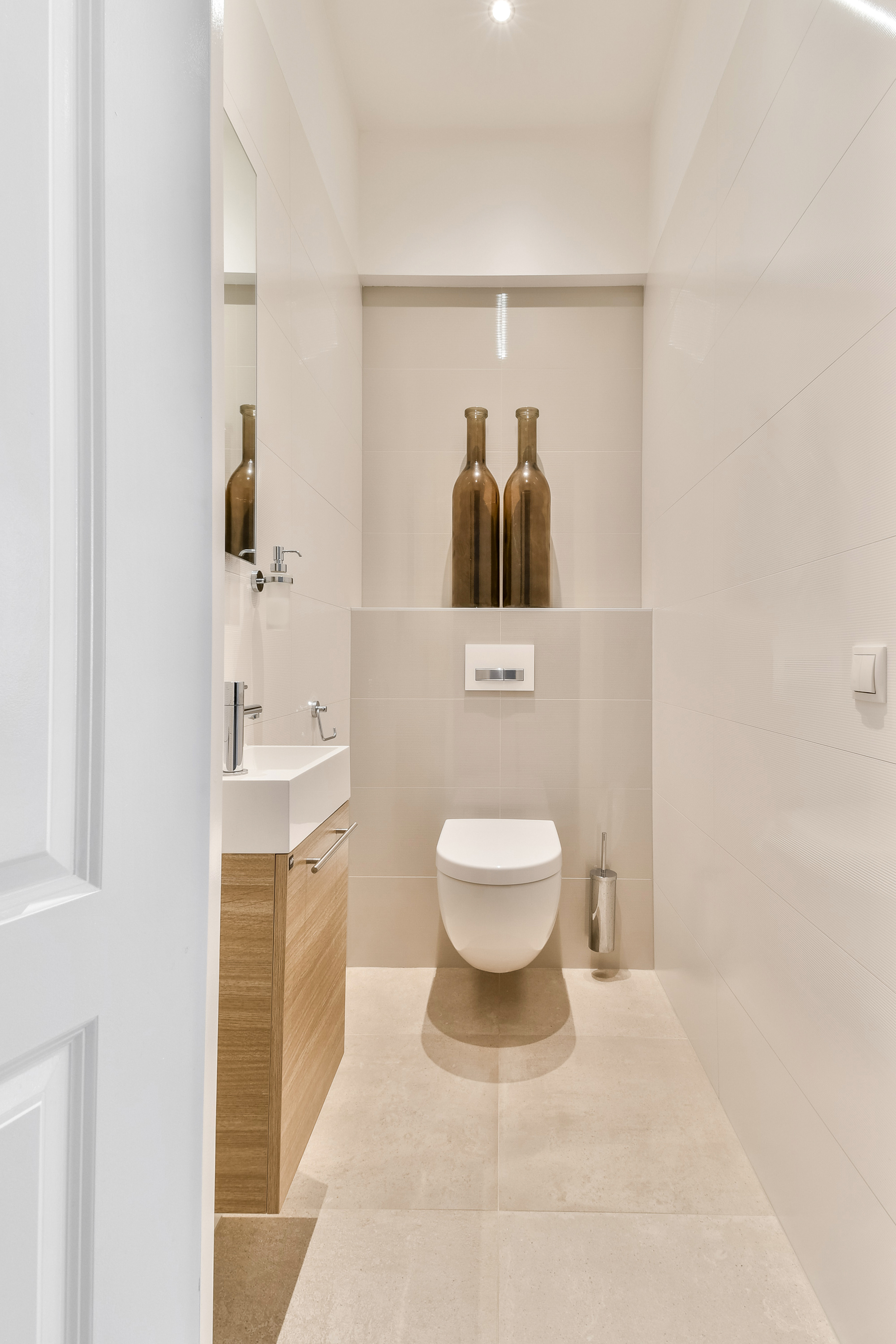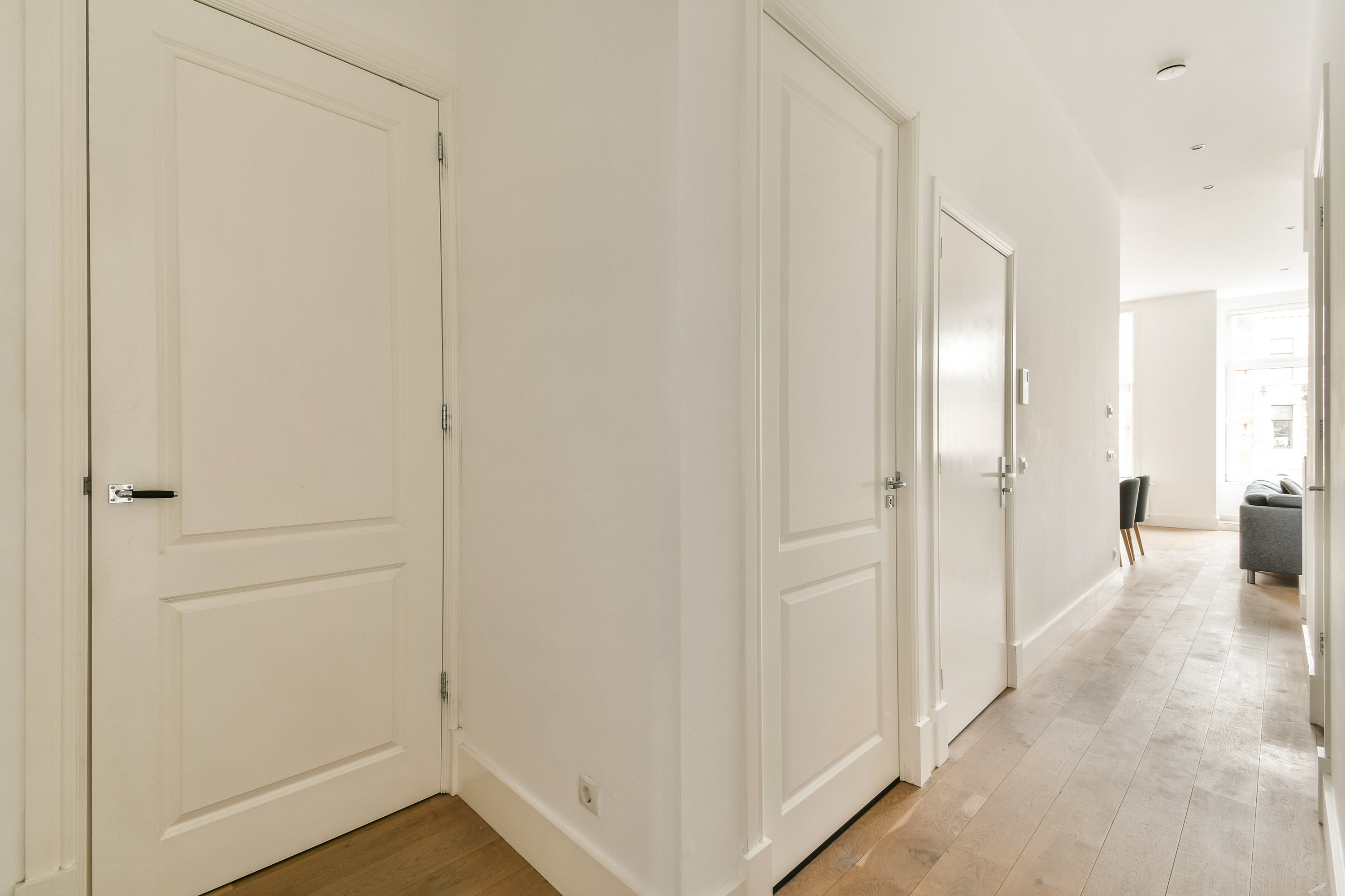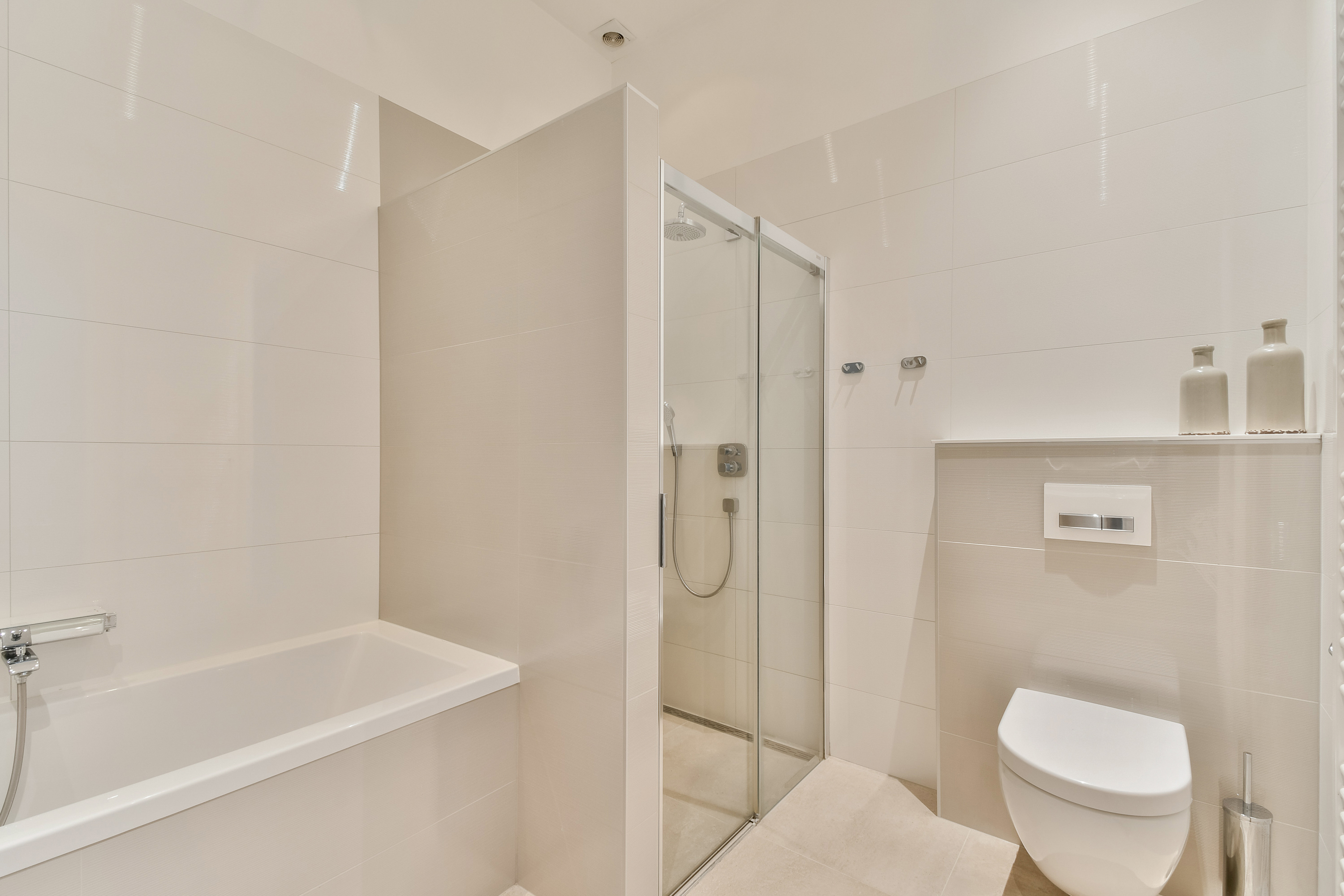 he entrance to the apartment is located on the first floor. Through the hallway, you walk to the front side, where the living room with open kitchen is situated. In the middle of the apartment is the spacious and luxurious bathroom, equipped with a bathtub, double sink, separate shower and a toilet. The hallway also provides access to a second toilet and a built-in cupboard housing the washing machine and central heating system. At the rear of the apartment, there is one large and one smaller bedroom.