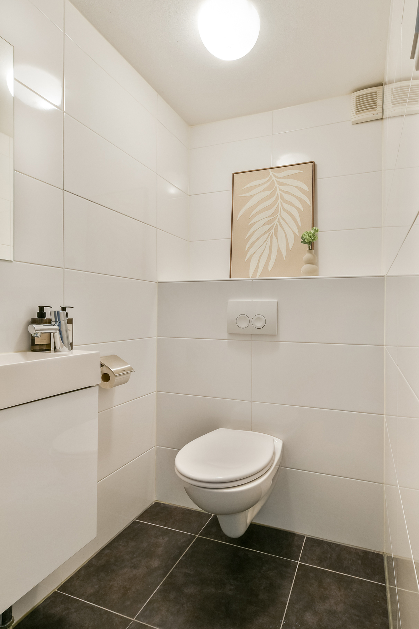 The apartment offers two well-proportioned bedrooms with built-in wardrobes. The bathroom is fitted with a bathtub, washbasin unit, heated towel rail and washing machine connection. A separate toilet with hand basin is located near the entrance.
