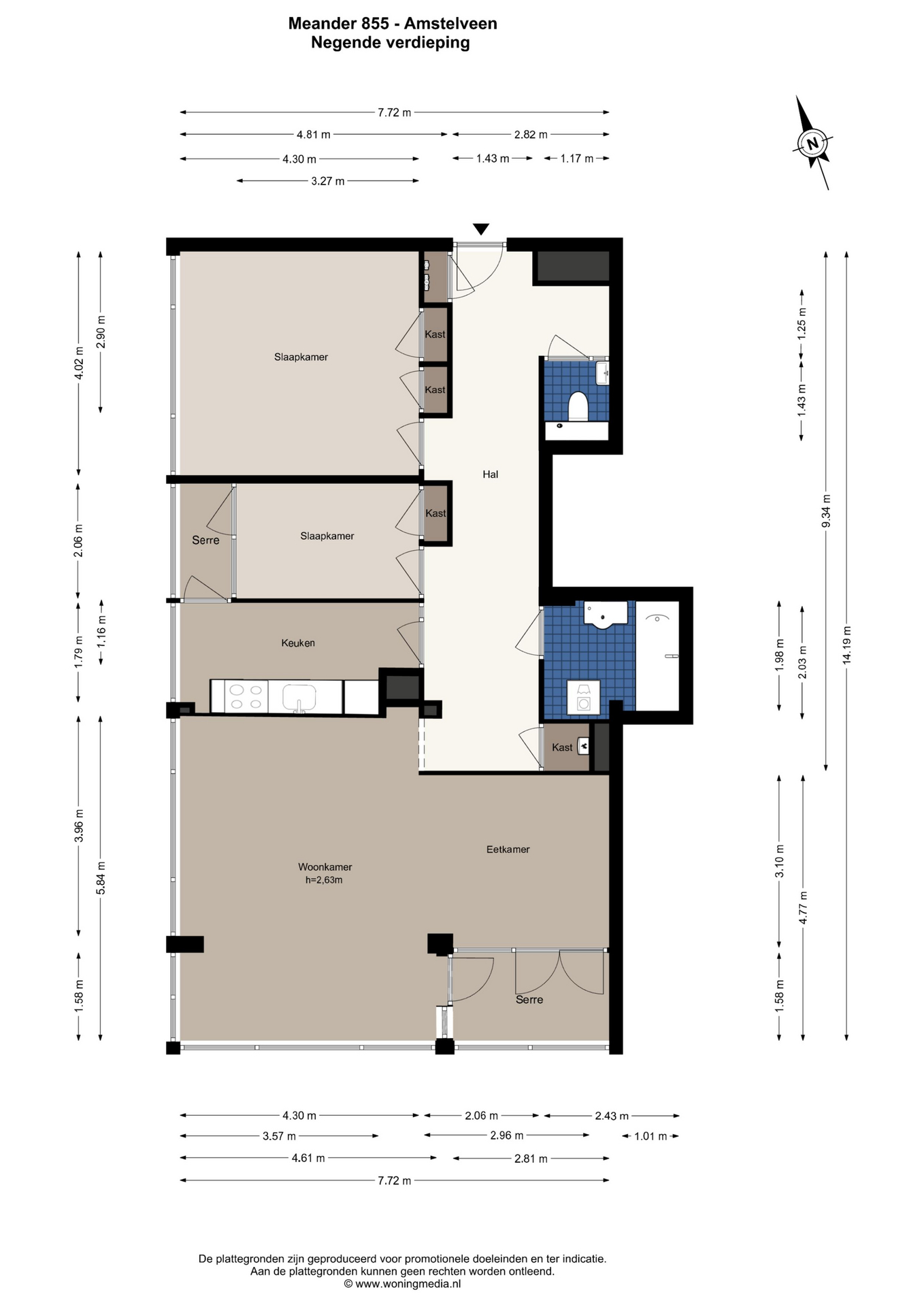 Via de nette centrale entree met lift bereikt u de negende etage. De ruime hal/entree geeft toegang tot alle vertrekken. De L-vormige woonkamer is royaal opgezet met een grote zithoek en ruim eetgedeelte. Dankzij de brede (8 meter) en hoge raampartijen geniet u van veel natuurlijk licht en een panoramisch uitzicht. Vanuit de woonkamer is er toegang tot de loggia op het zuiden, waar u beschut van de zon kunt genieten.