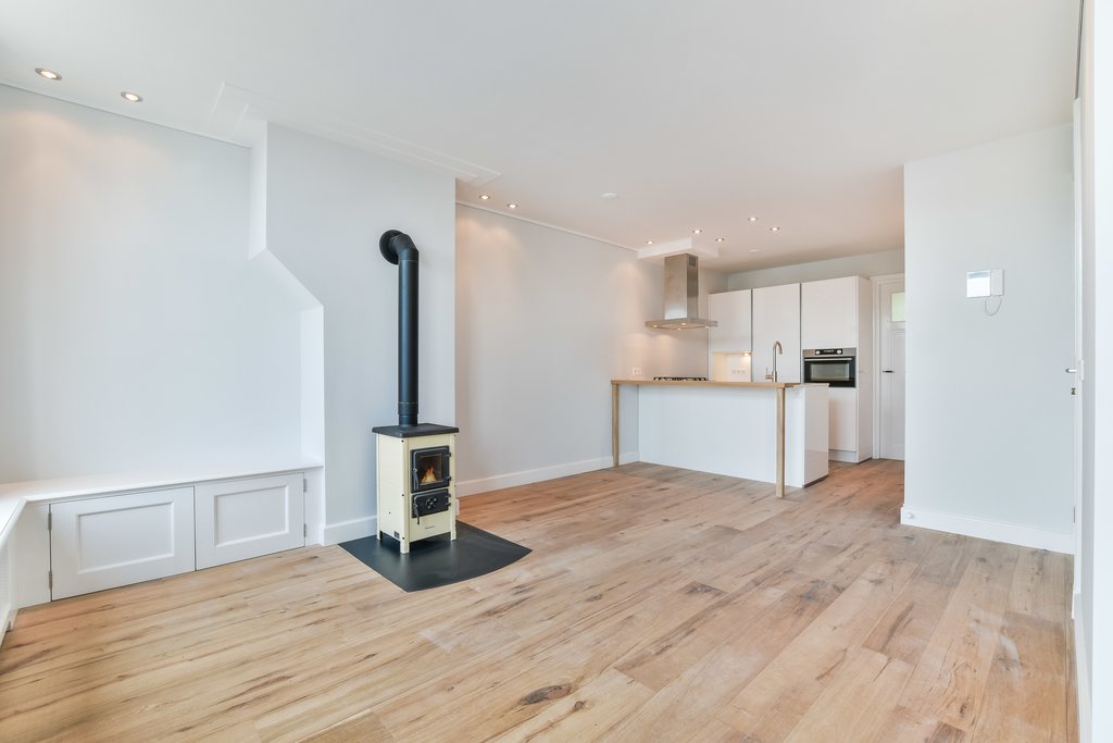 De woonkamer is drie ramen breed en voorzien van een gezellige houtkachel. De open keuken beschikt over diverse inbouwapparatuur.